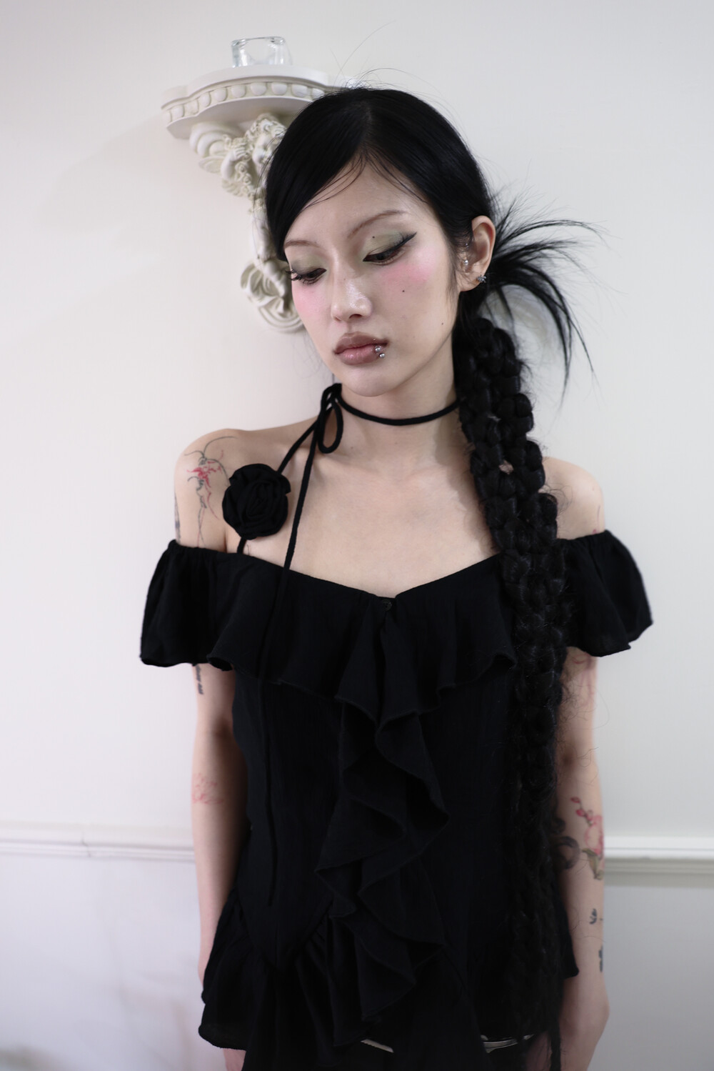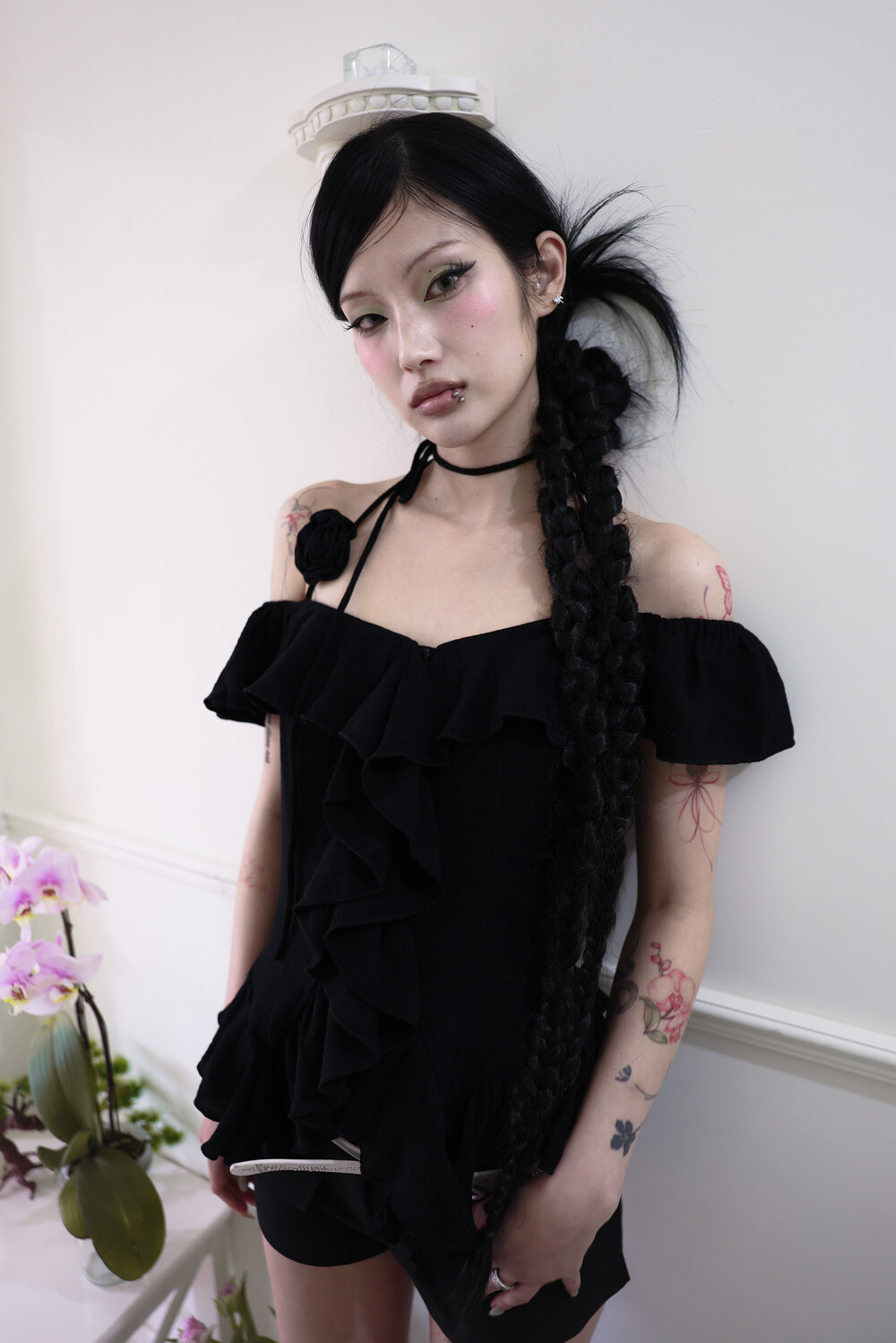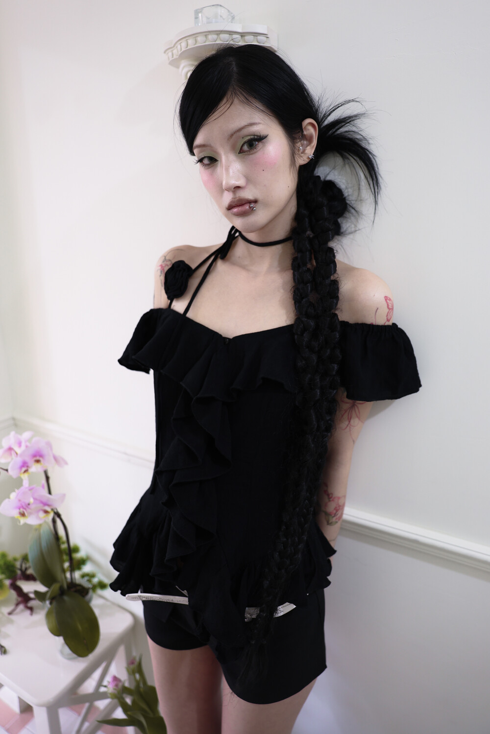 [Pink orchid house] Rose corsage frill top (2color) (Black)