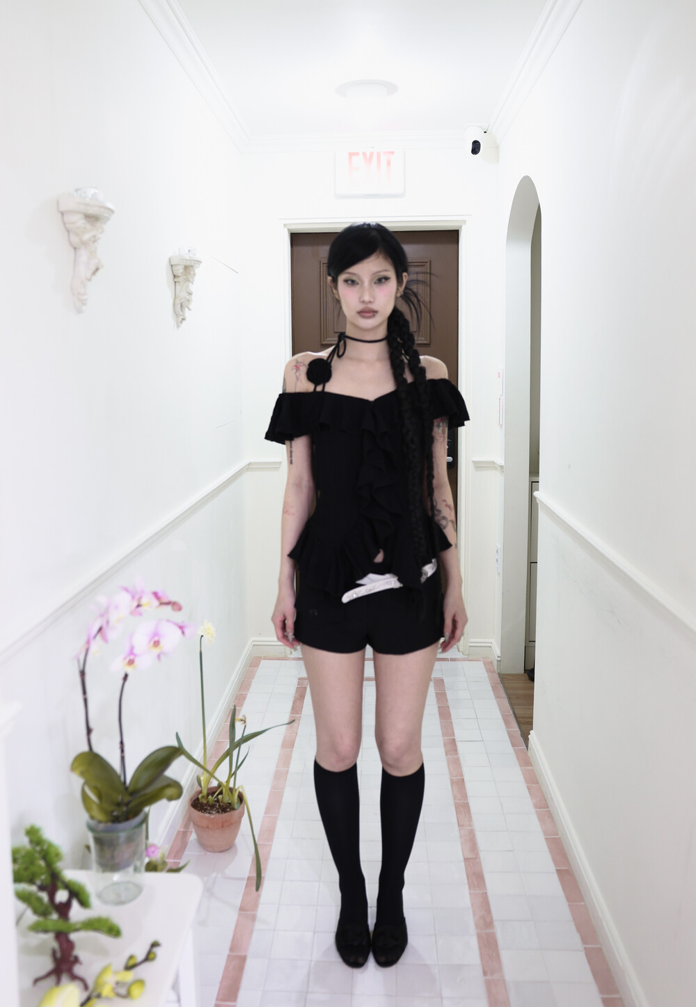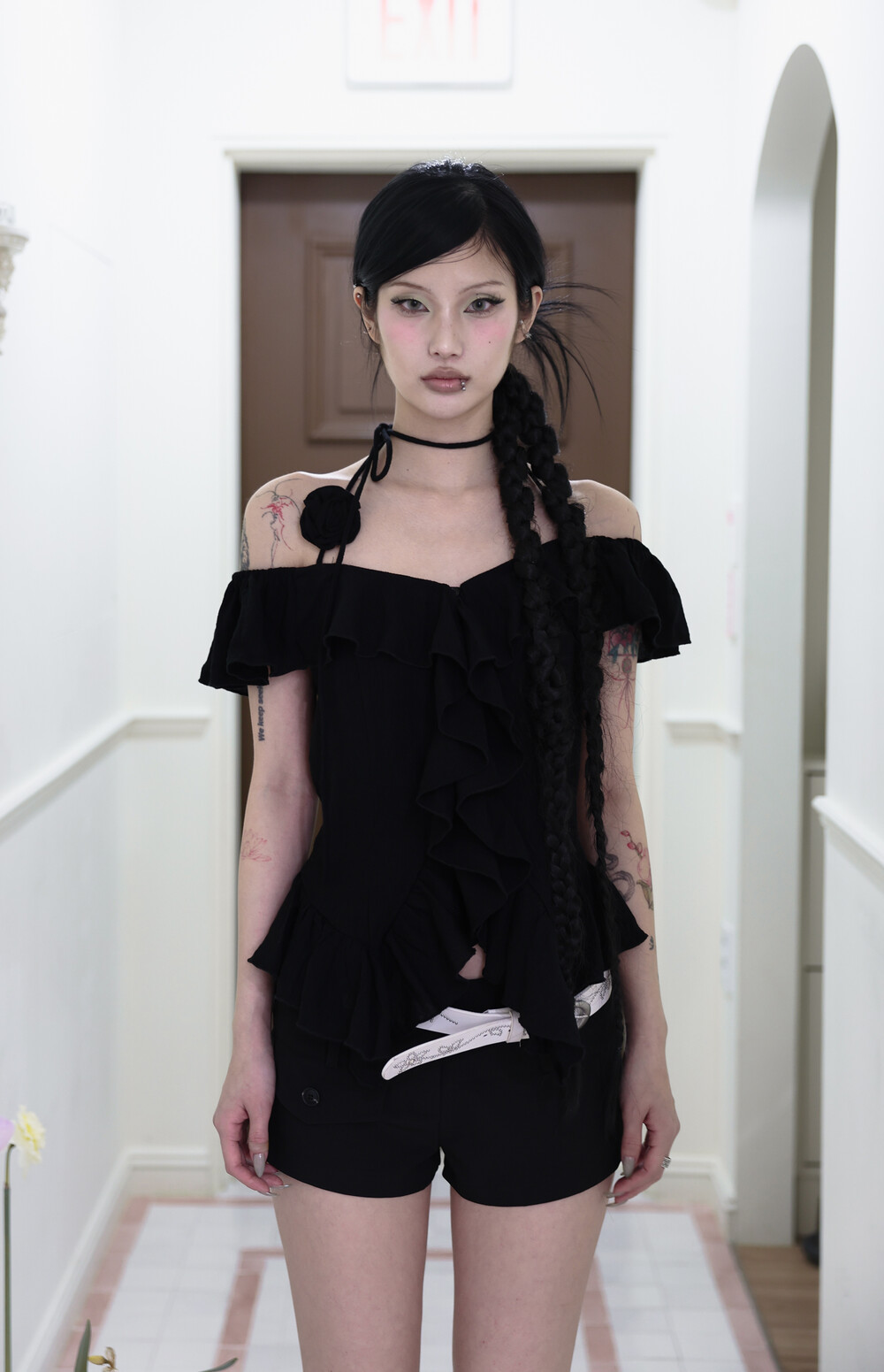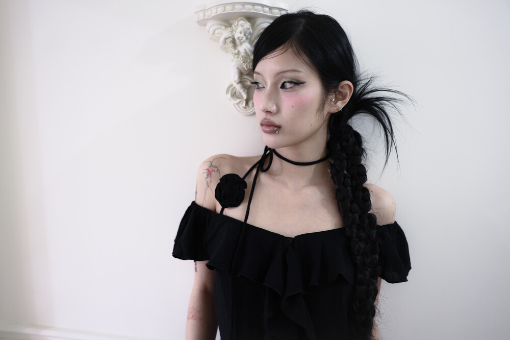 [Pink orchid house] Rose corsage frill top (2color) (Black)