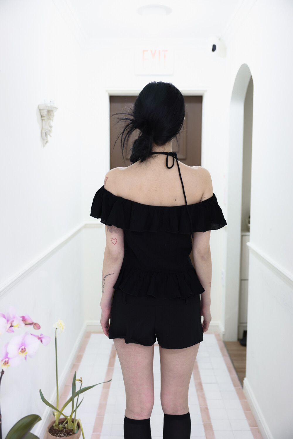 - 넓은 넥 라인으로 여리여리한 아웃핏 연출
