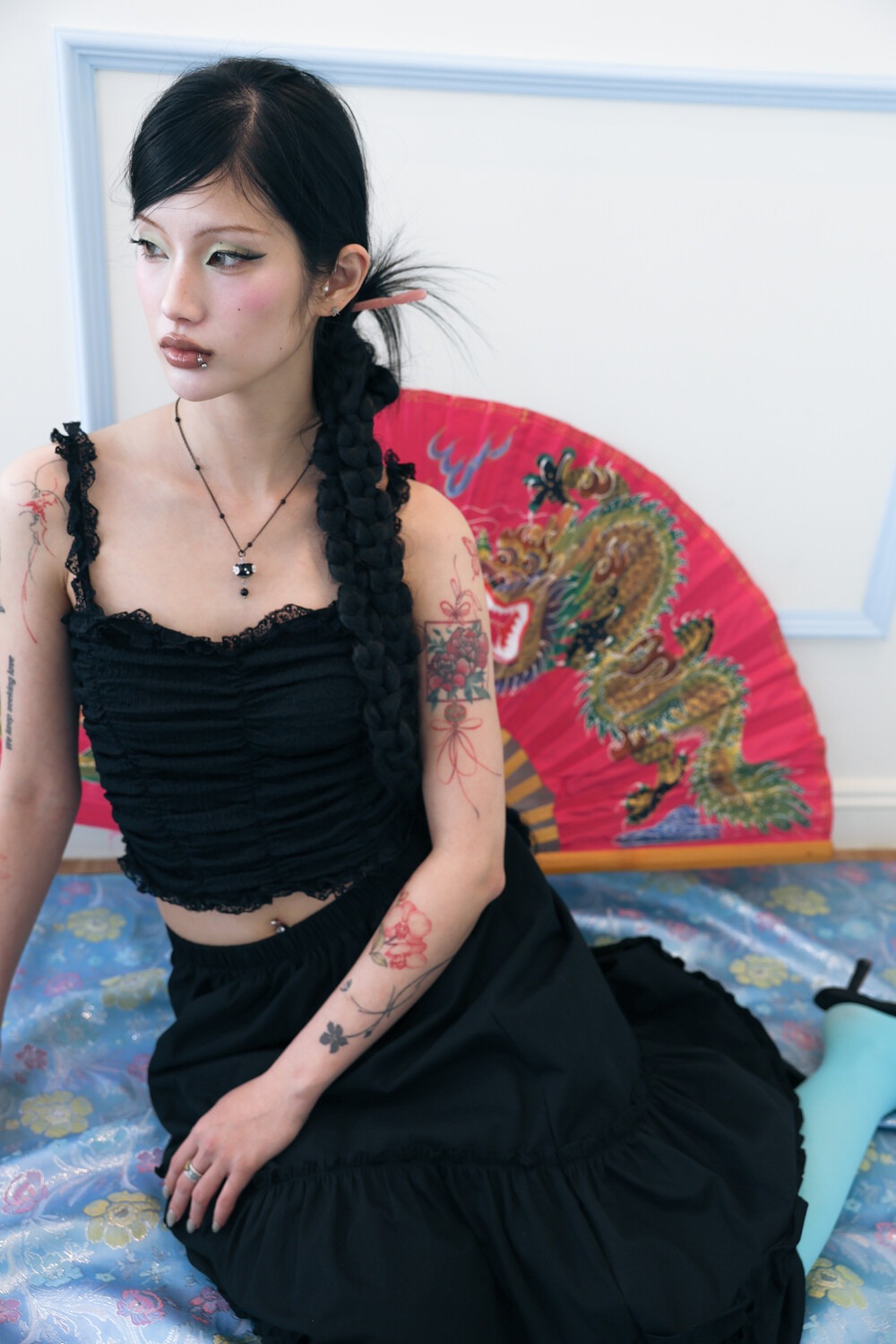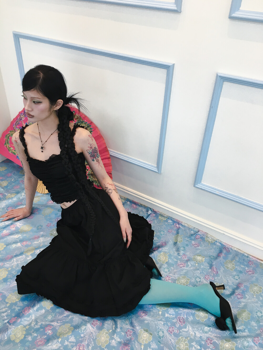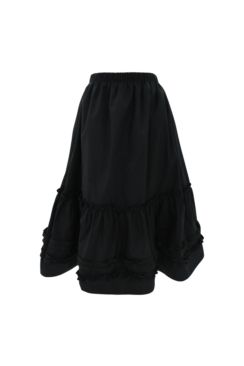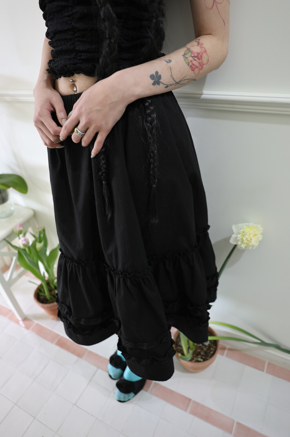 [Pink orchid house] Shirring cancan midi skirt (2color) (Black)