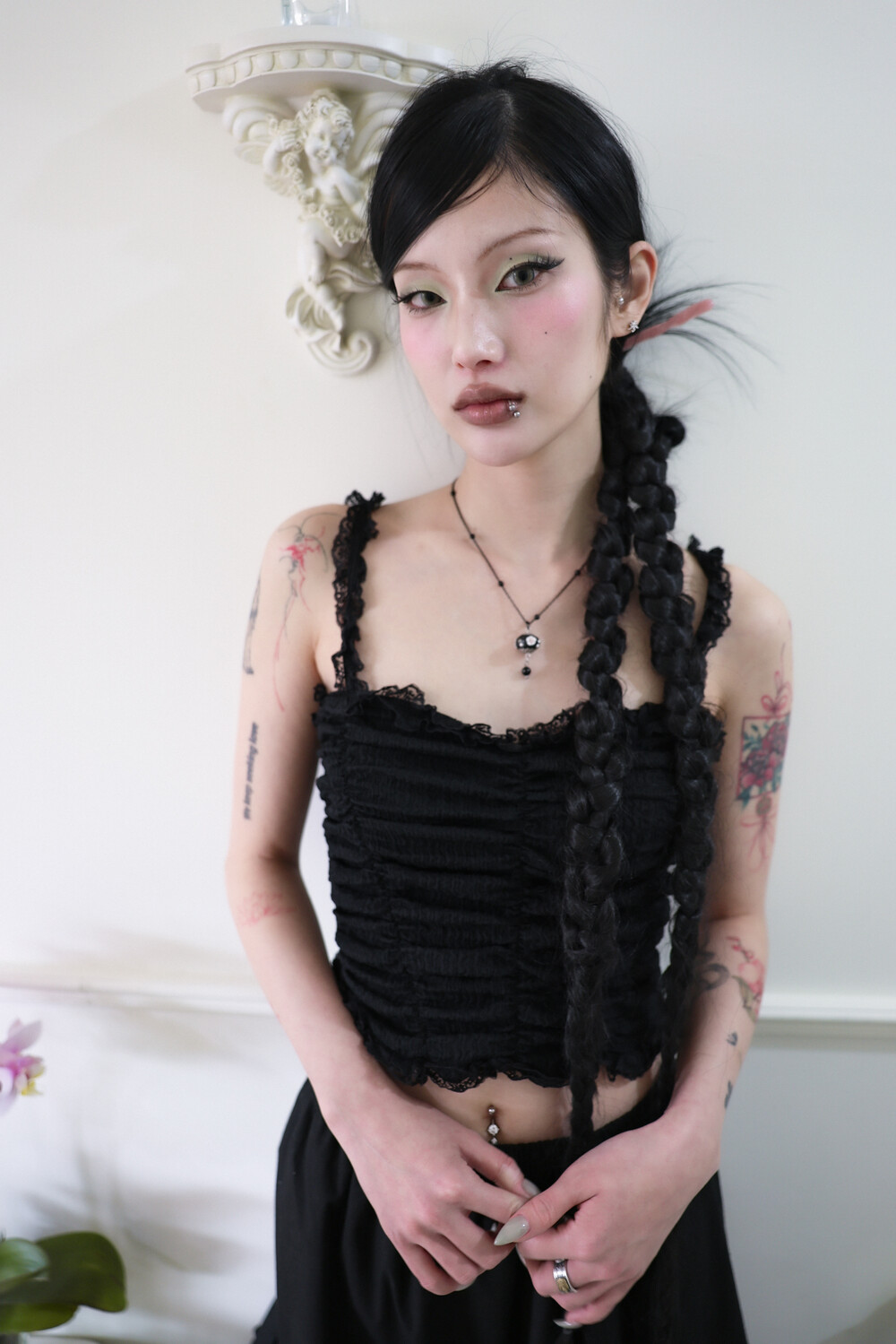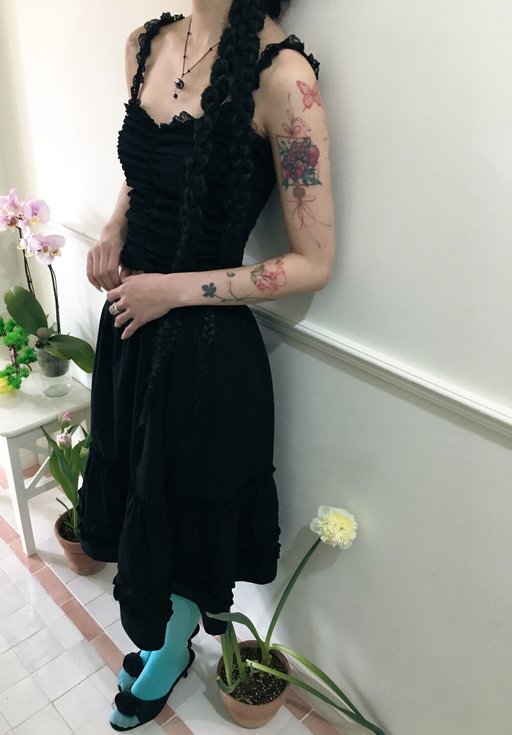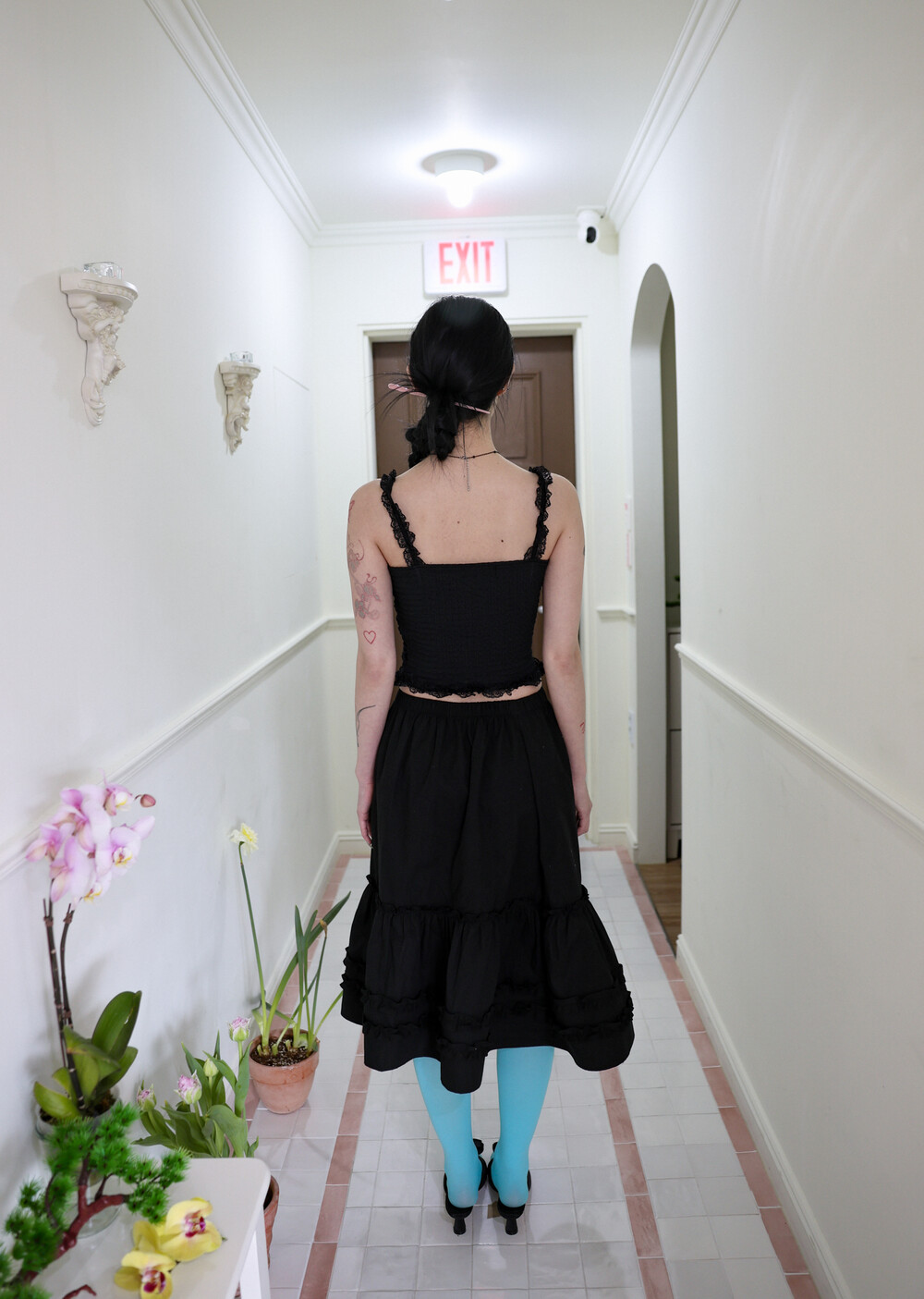 [Pink orchid house] Shirring cancan midi skirt (2color) (Black)