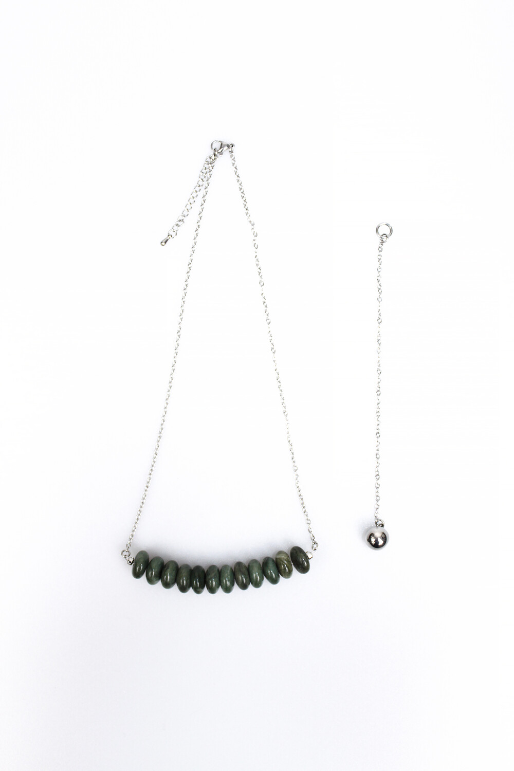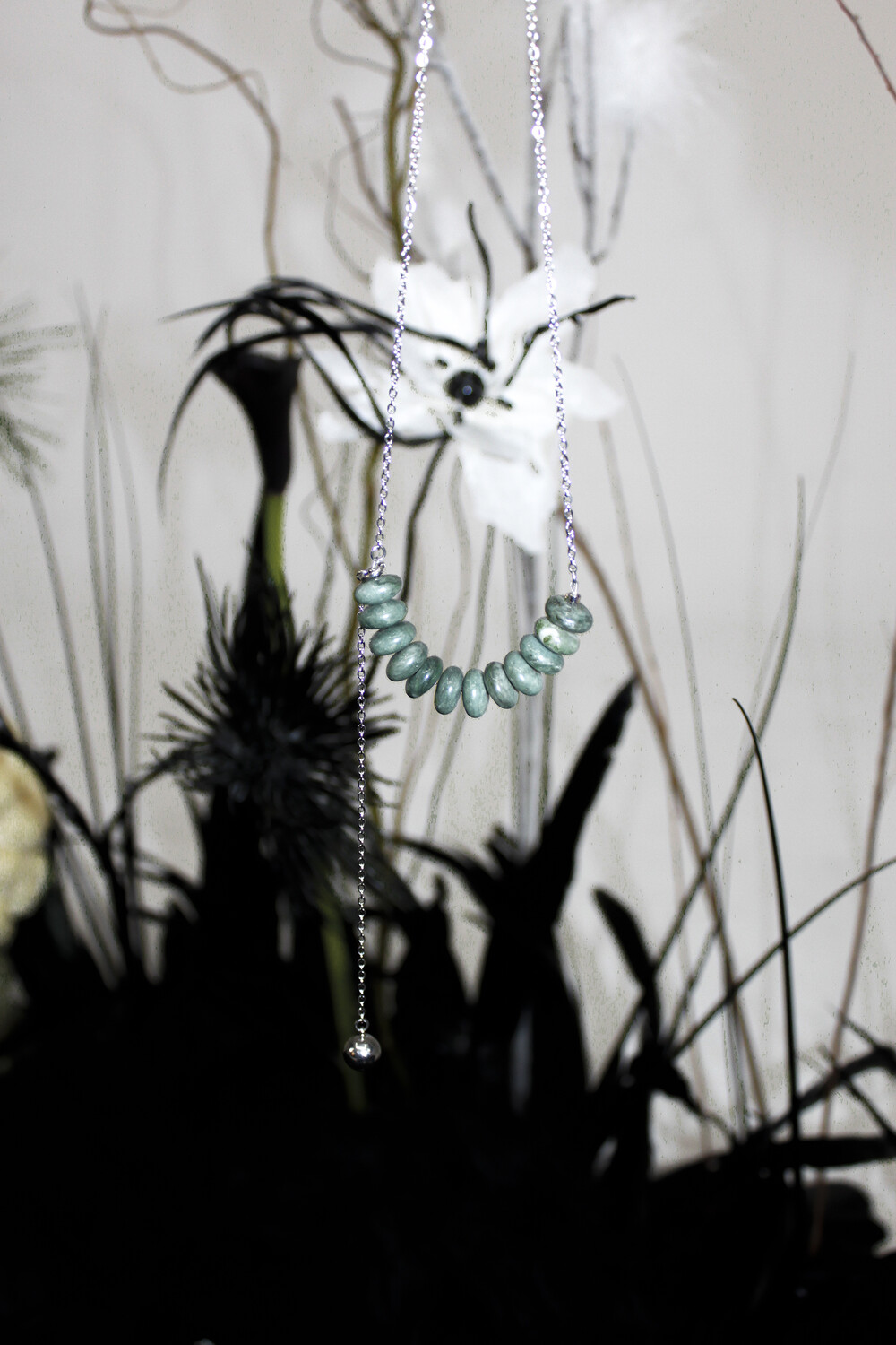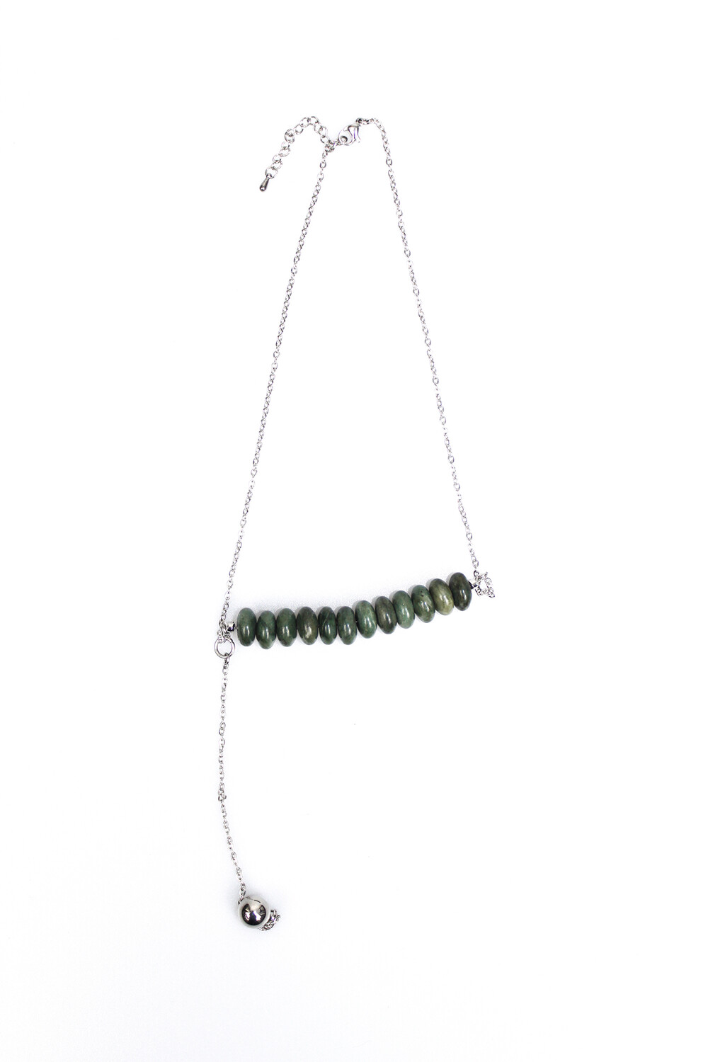 천연 옥이 하나의 줄로 연결된 단아하면서도 유니크한 무드의 만년청 necklace입니다.