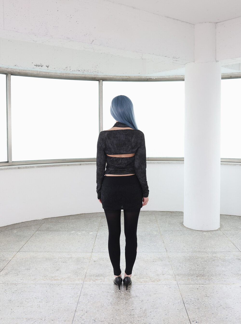 전면 바스트 라인은 자연스러운 드레이프로 흐르듯 형성되어 여성스러운 실루엣을 강조하며,
