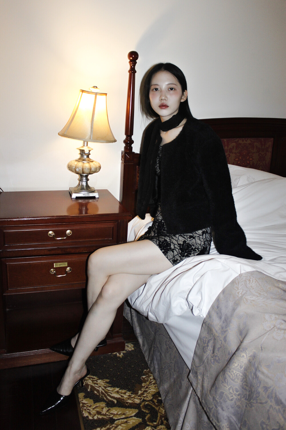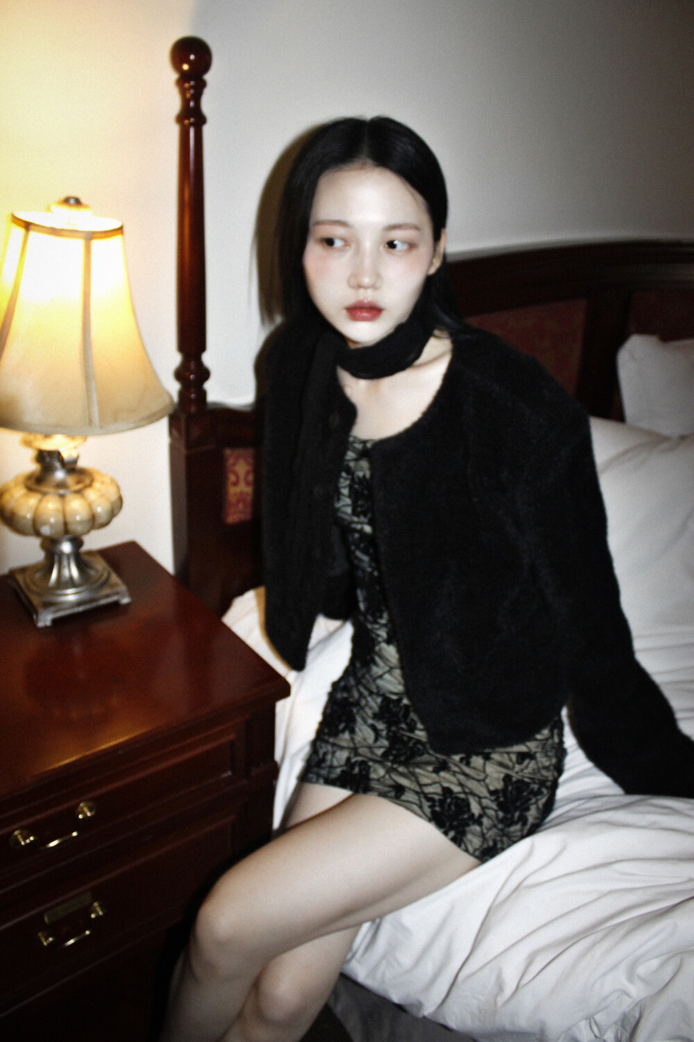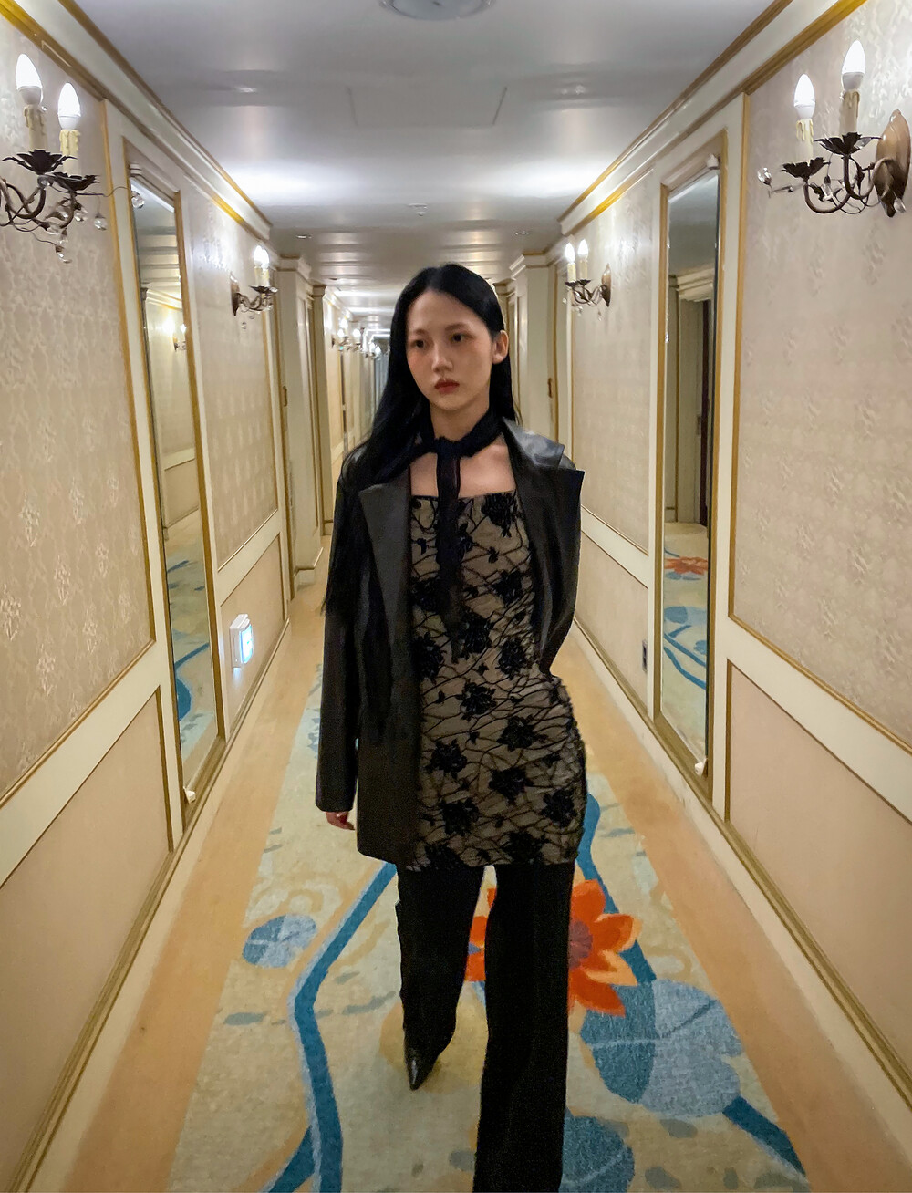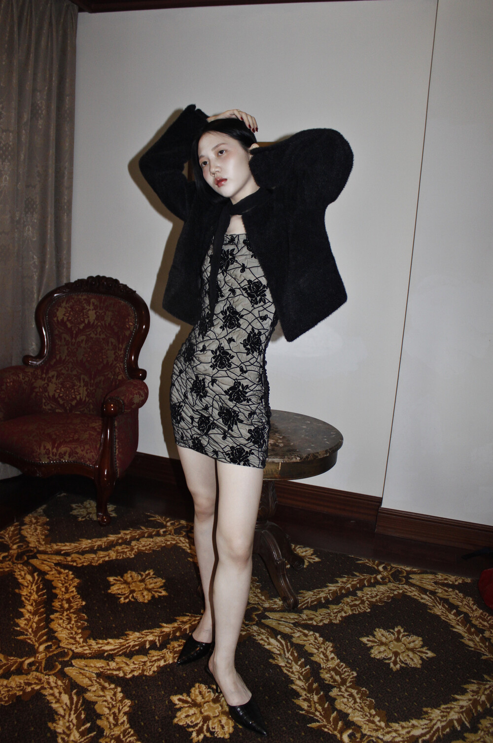 베이지 컬러 원피스 위로 플라워 레이스 원단을 겹쳐