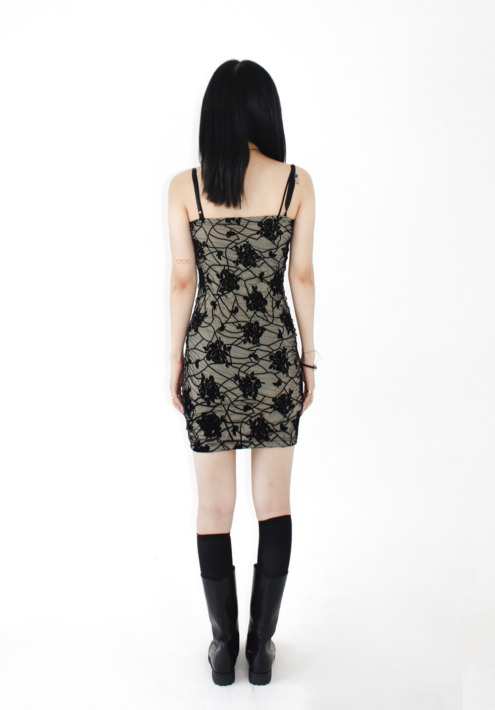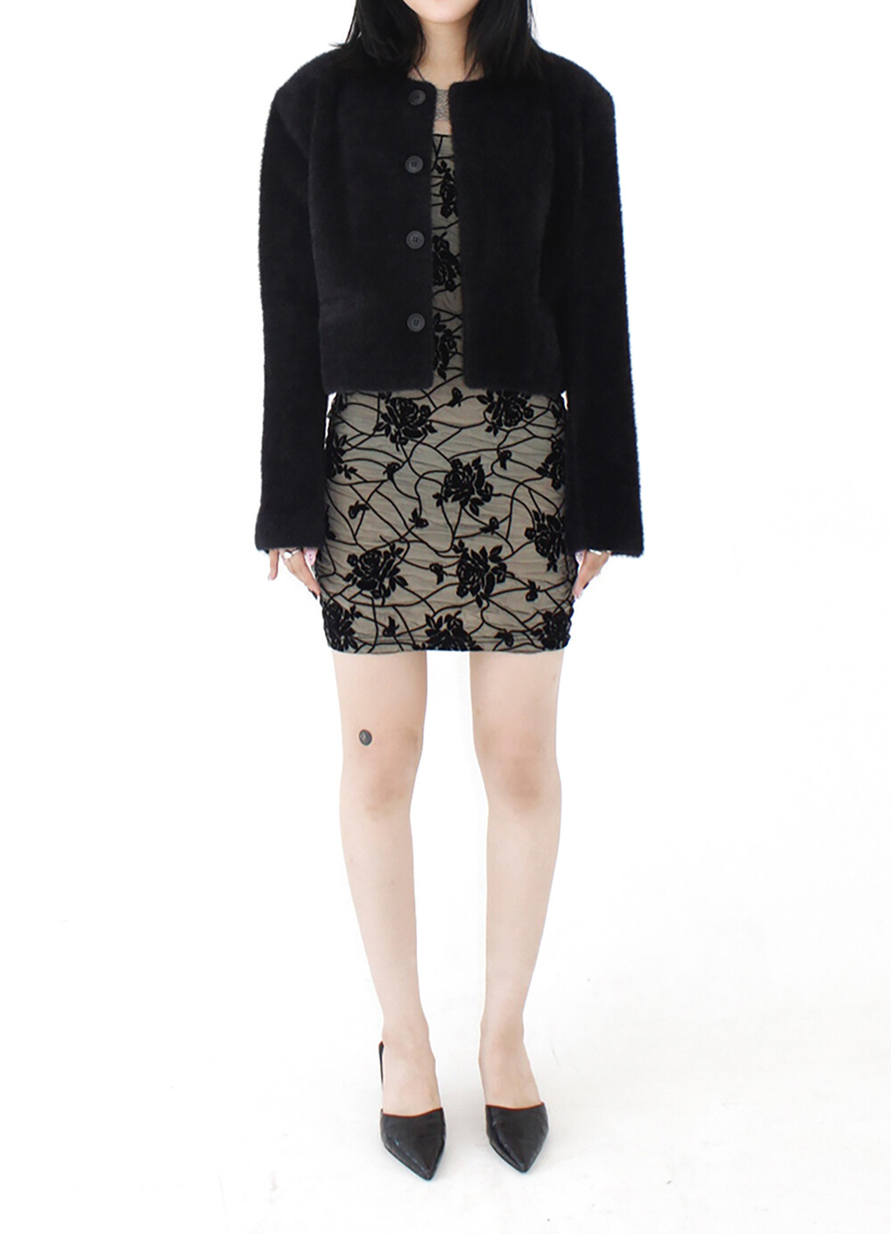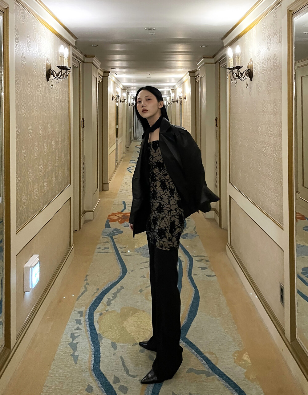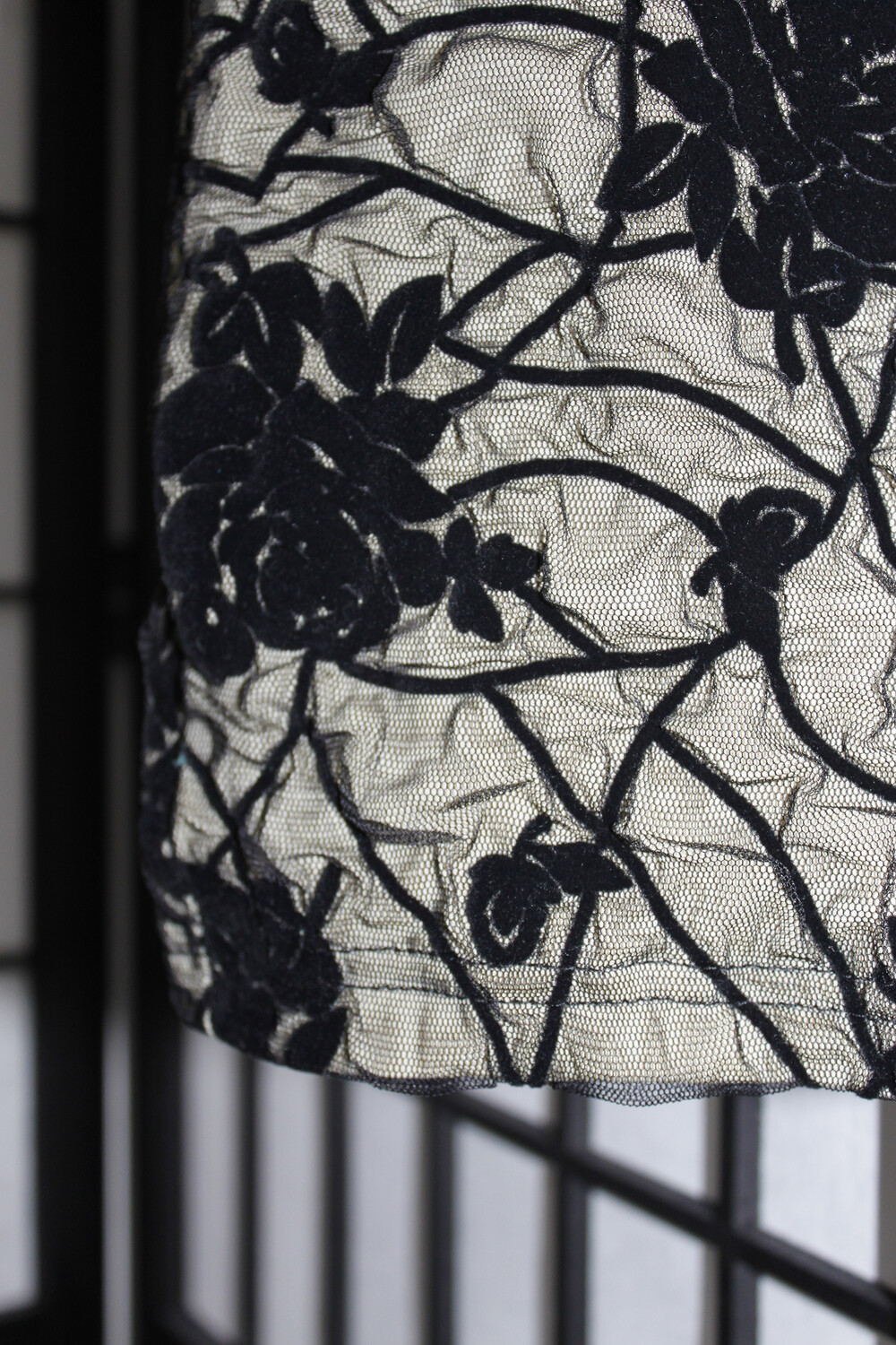 베이지 컬러 원피스 위로 플라워 레이스 원단을 겹쳐