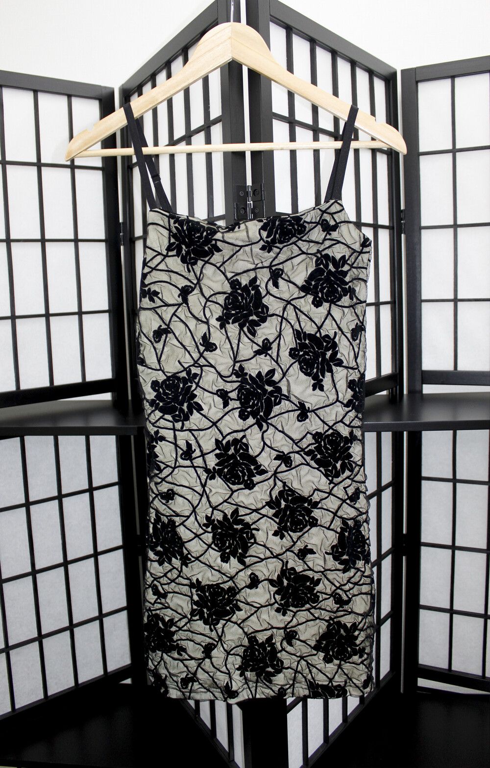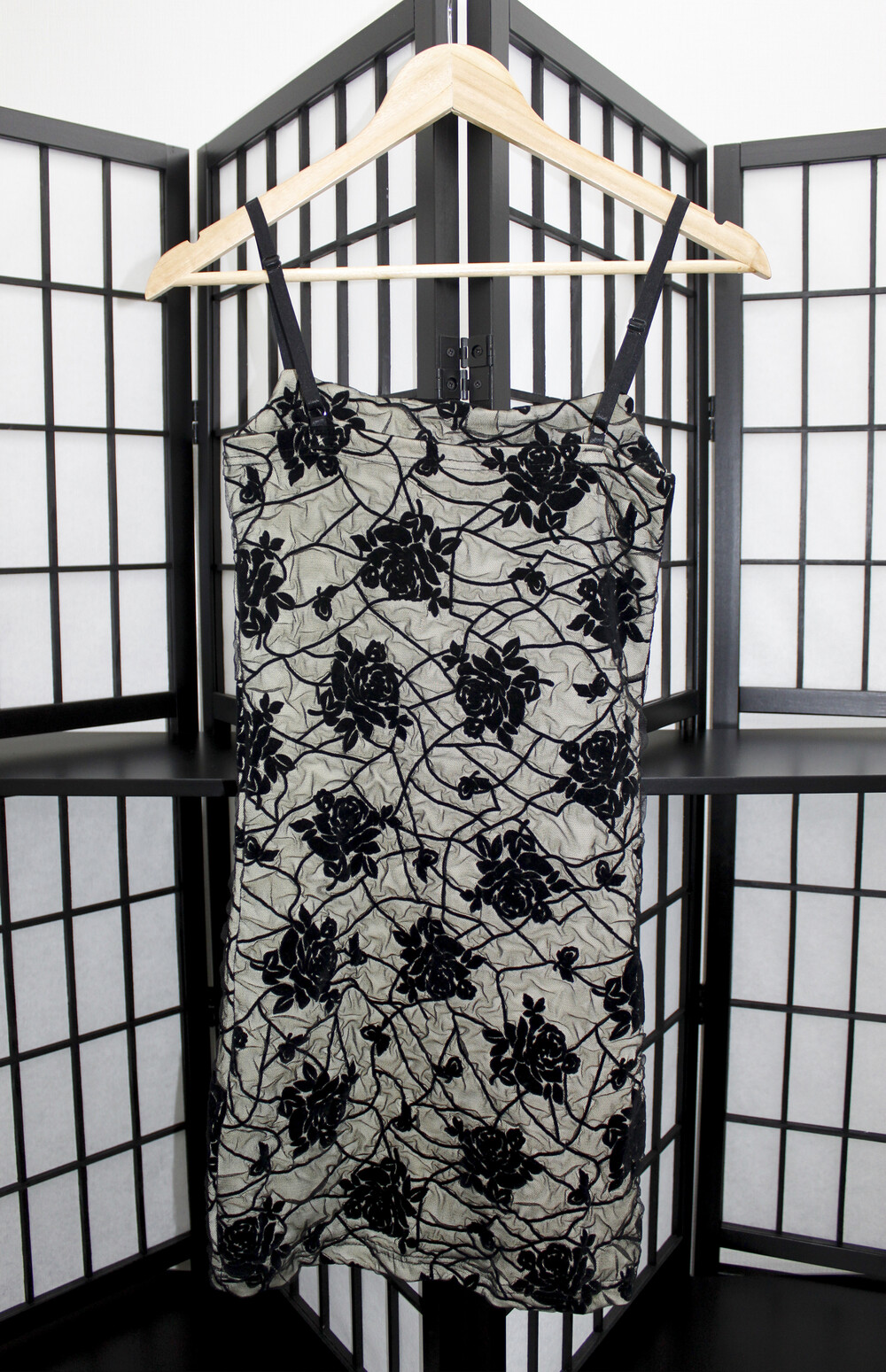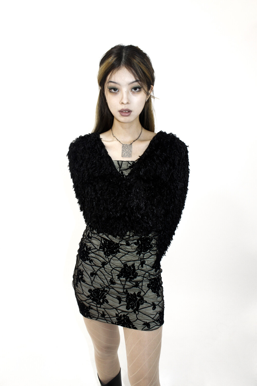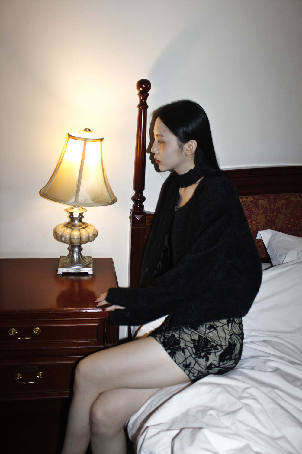 베이지 컬러 원피스 위로 플라워 레이스 원단을 겹쳐