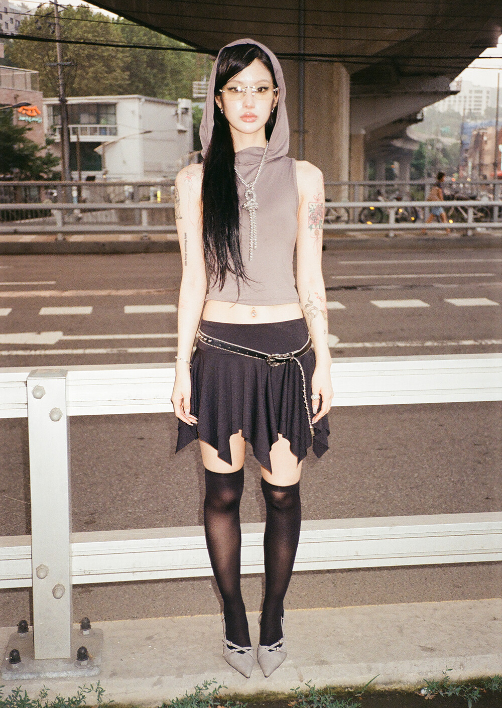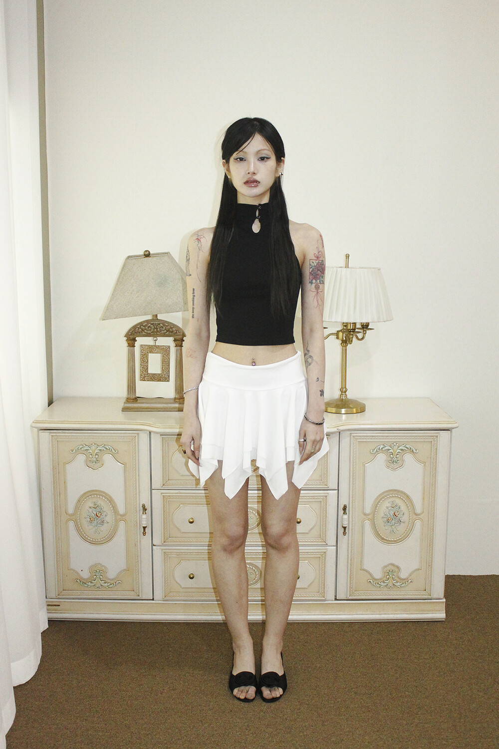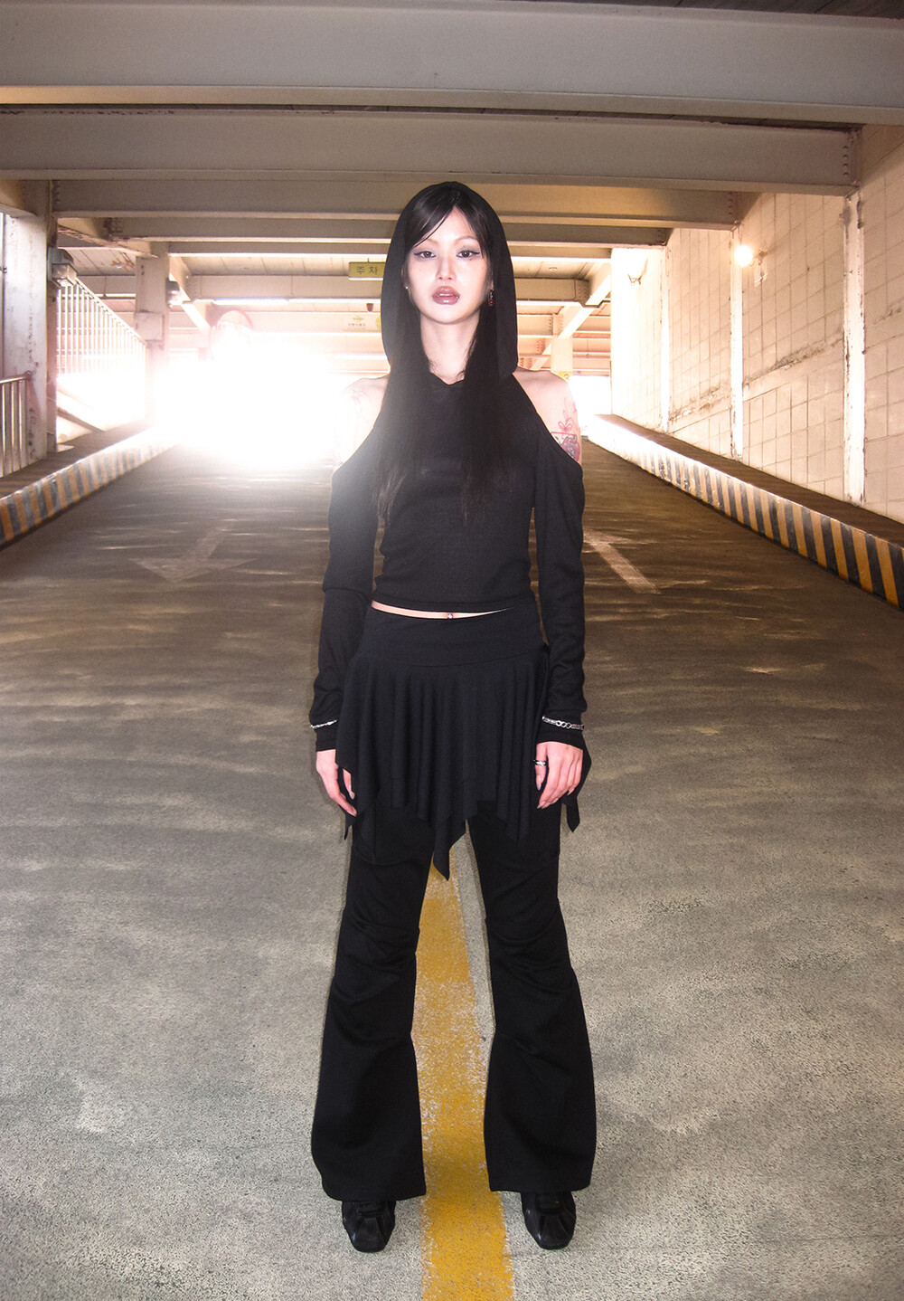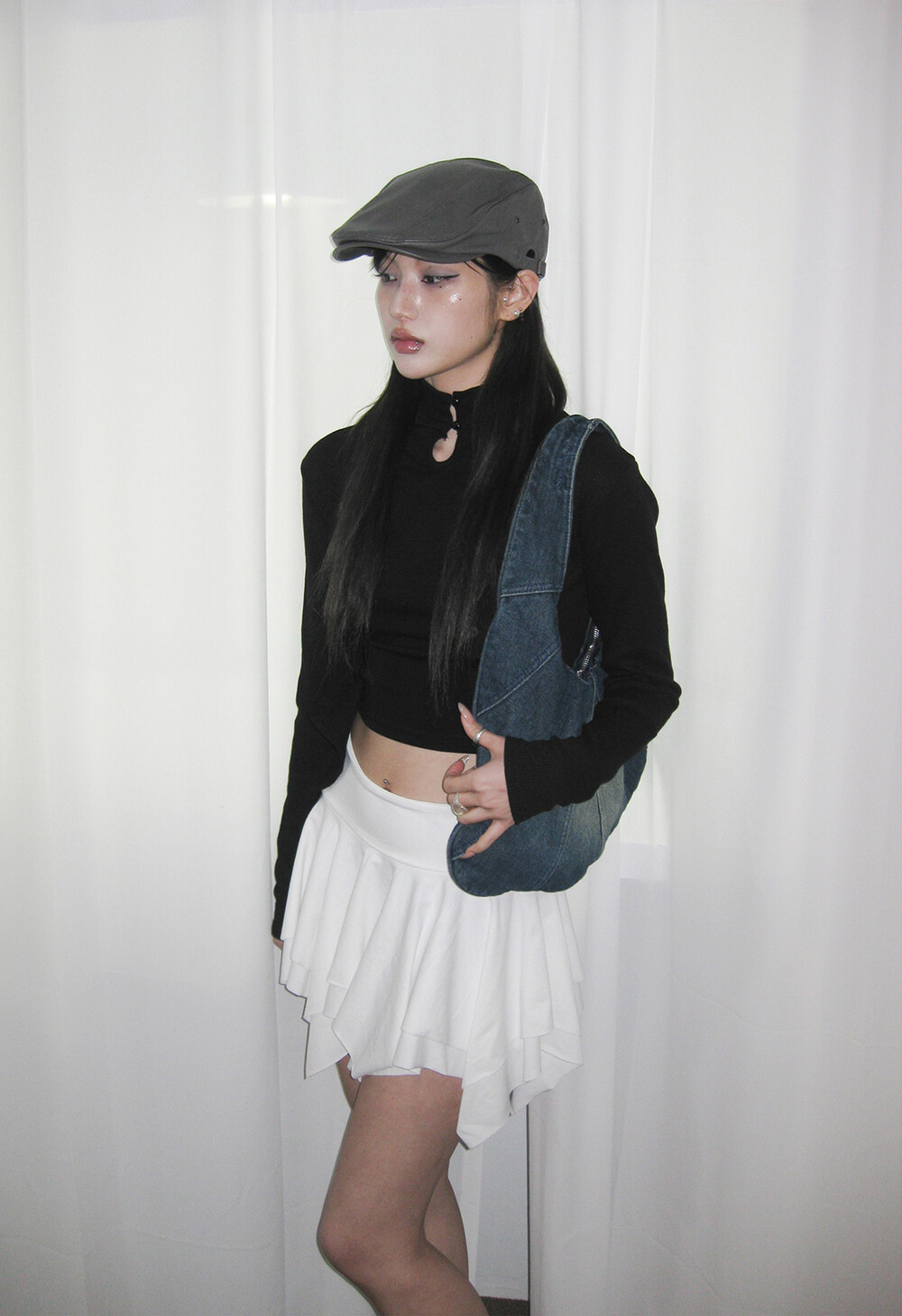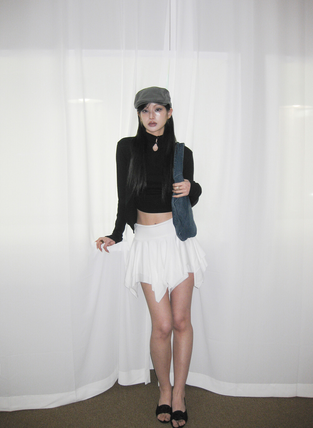 2겹의 원단이 언발 느낌으로 겹쳐진 디자인의 로우 라이즈 스커트입니다.