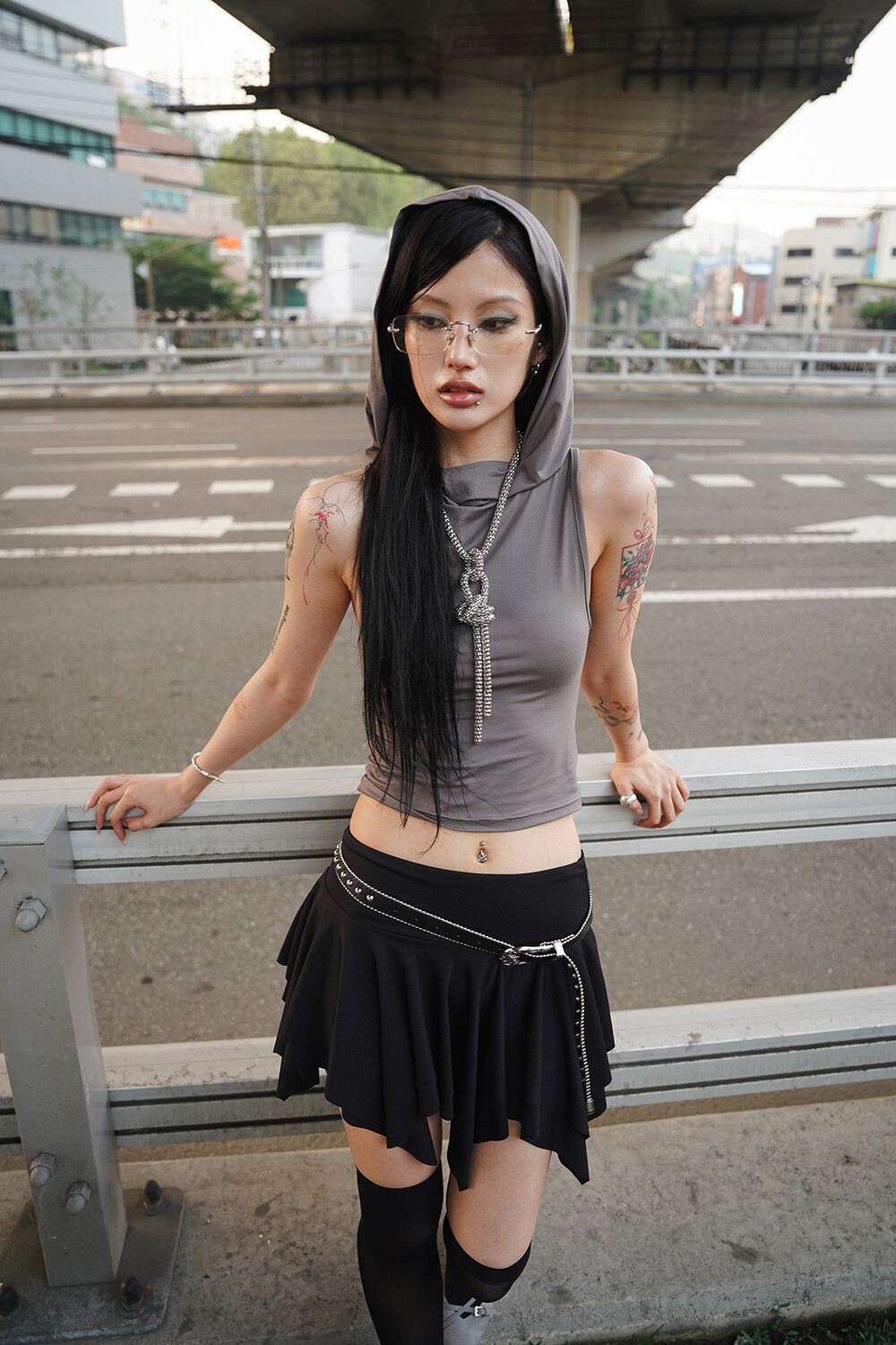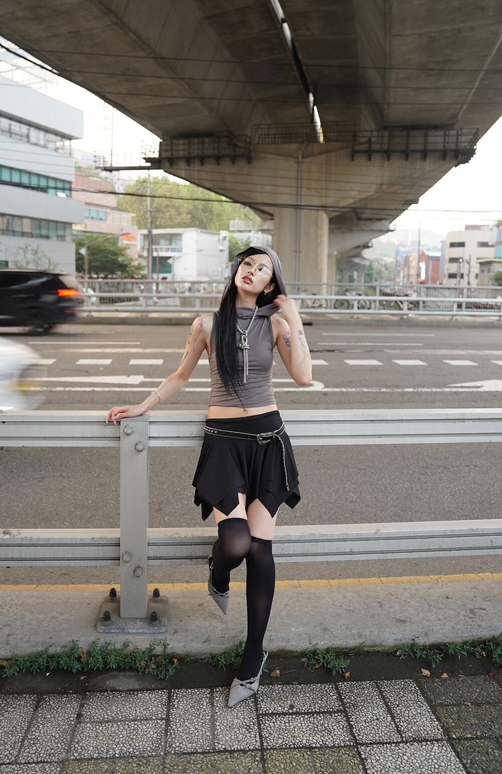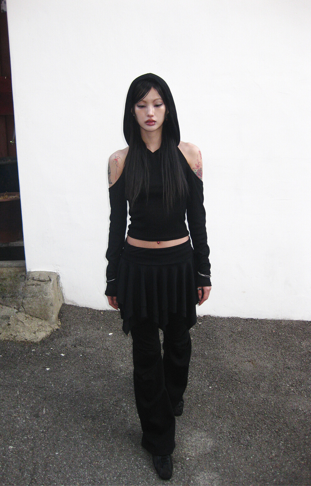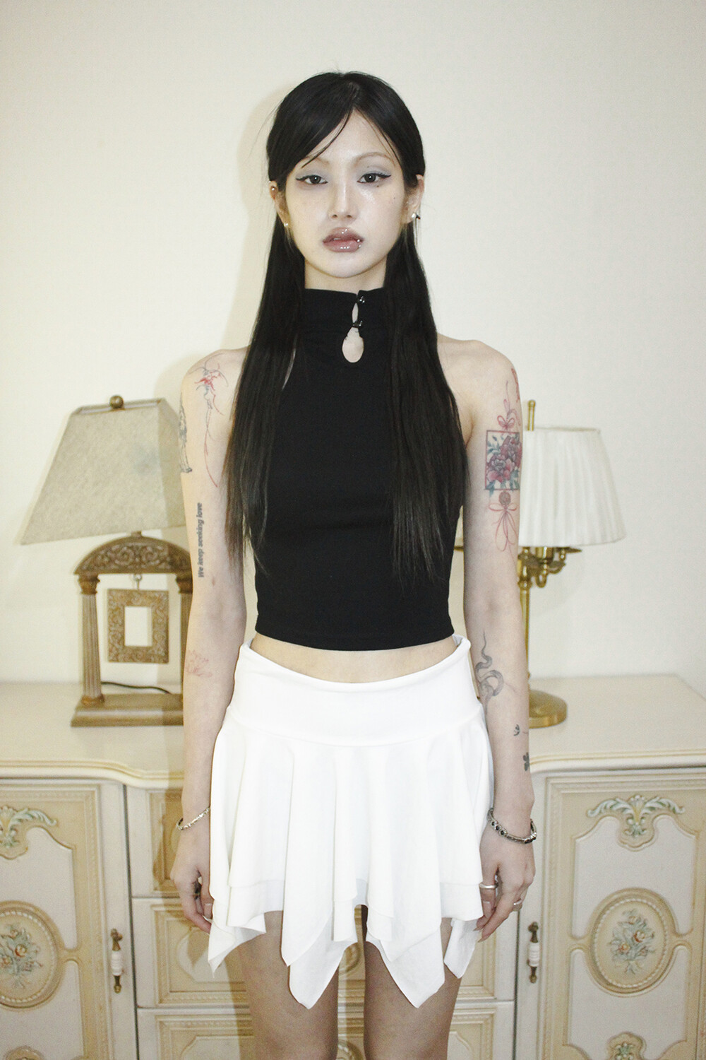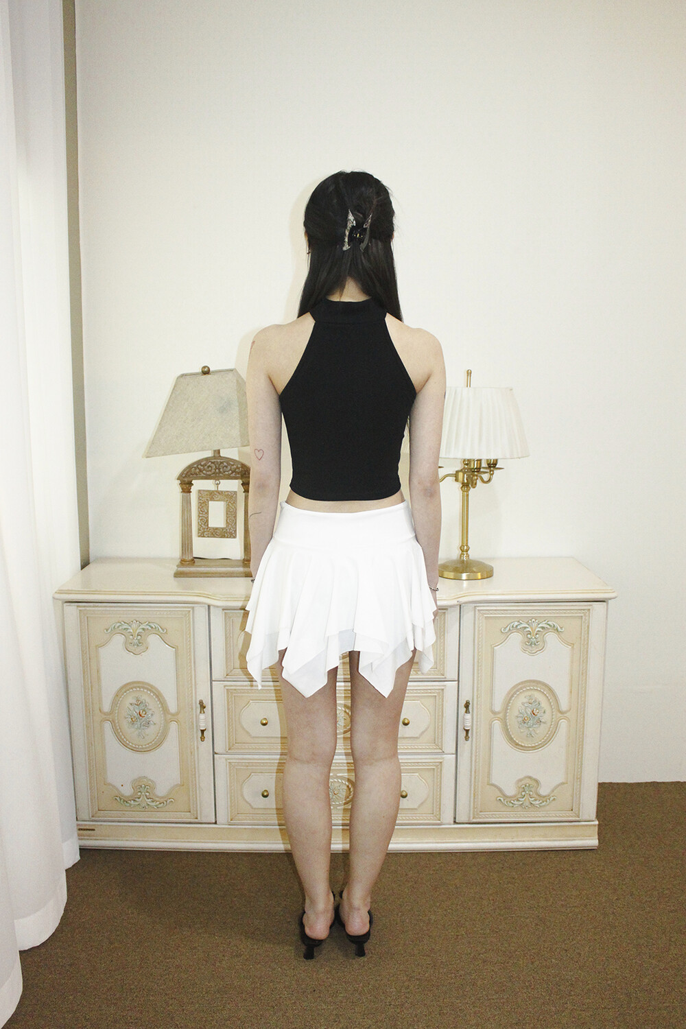 2겹의 원단이 언발 느낌으로 겹쳐진 디자인의 로우 라이즈 스커트입니다.