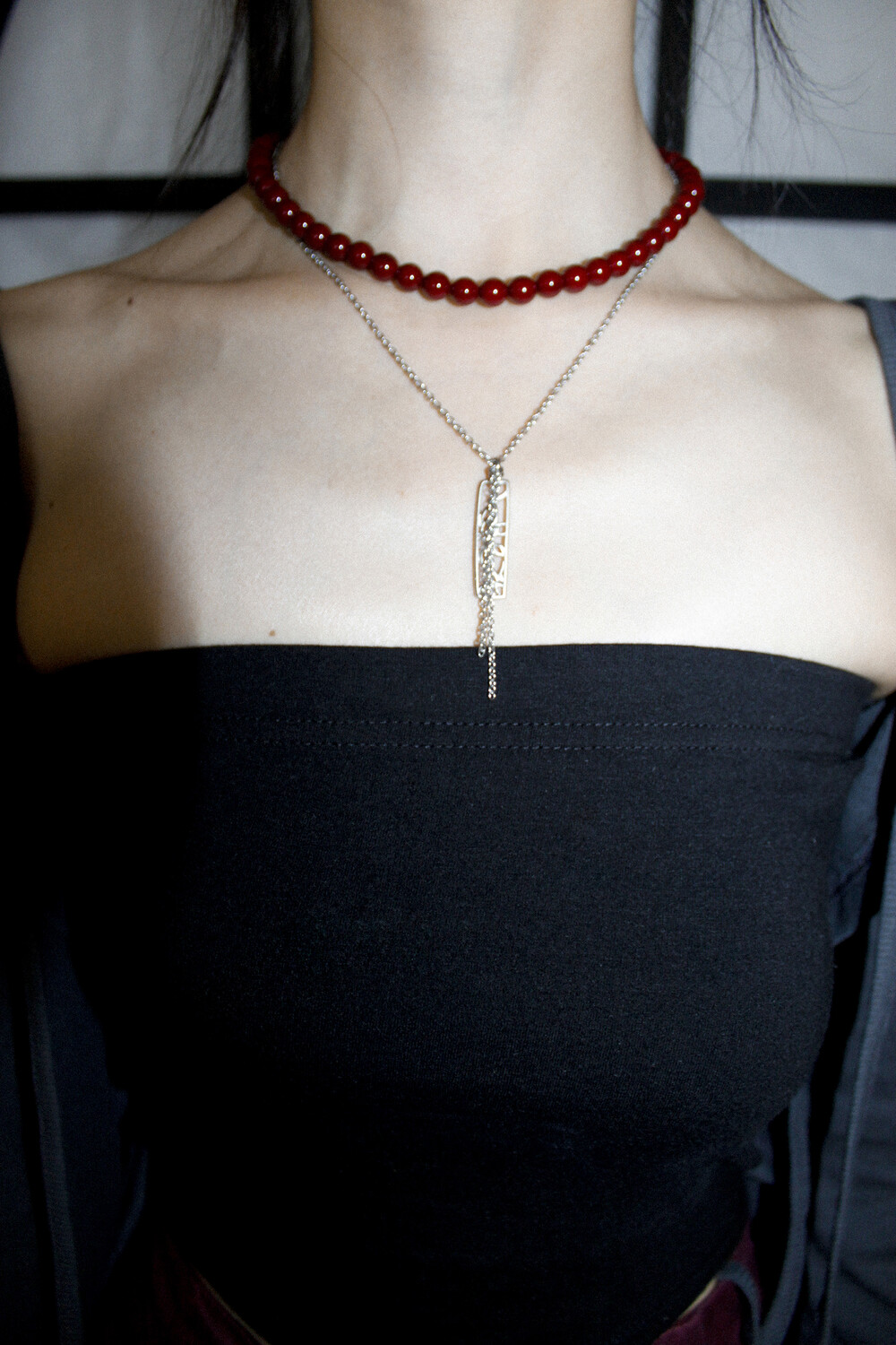 두 줄의 짧은 써지컬 체인을 레이어드한 목걸이 입니다.