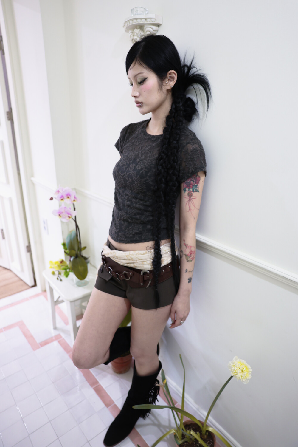 [Pink orchid house] Flower lace T (4color) (Gray)