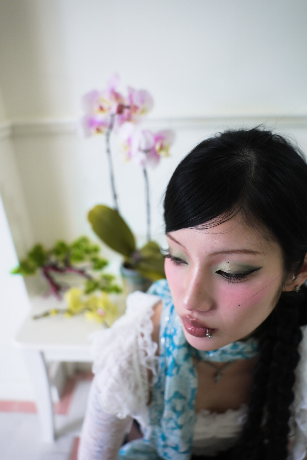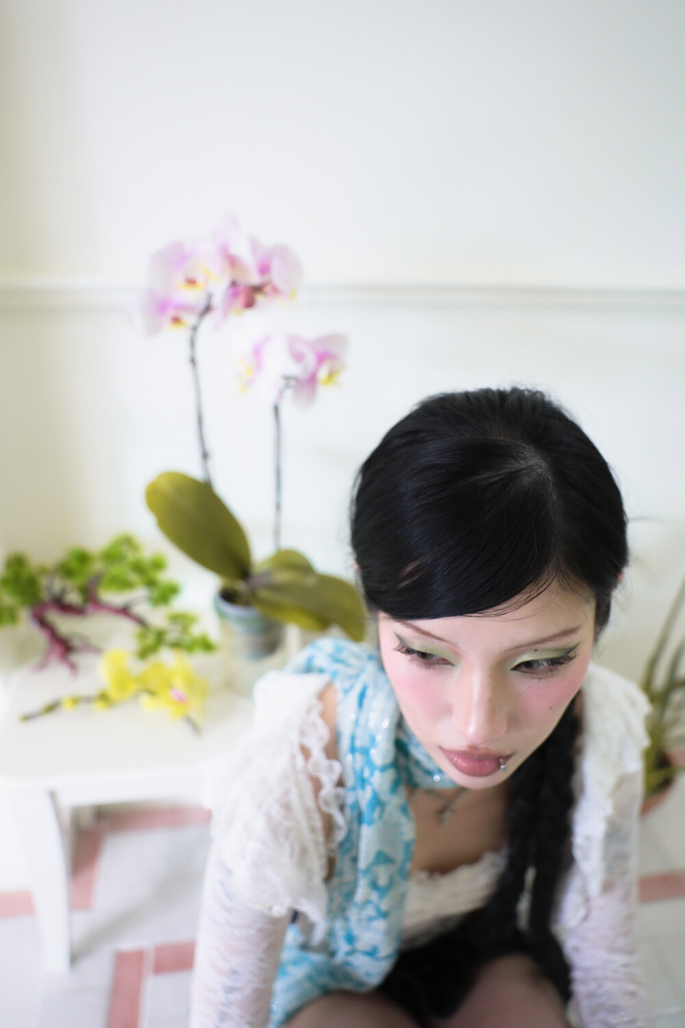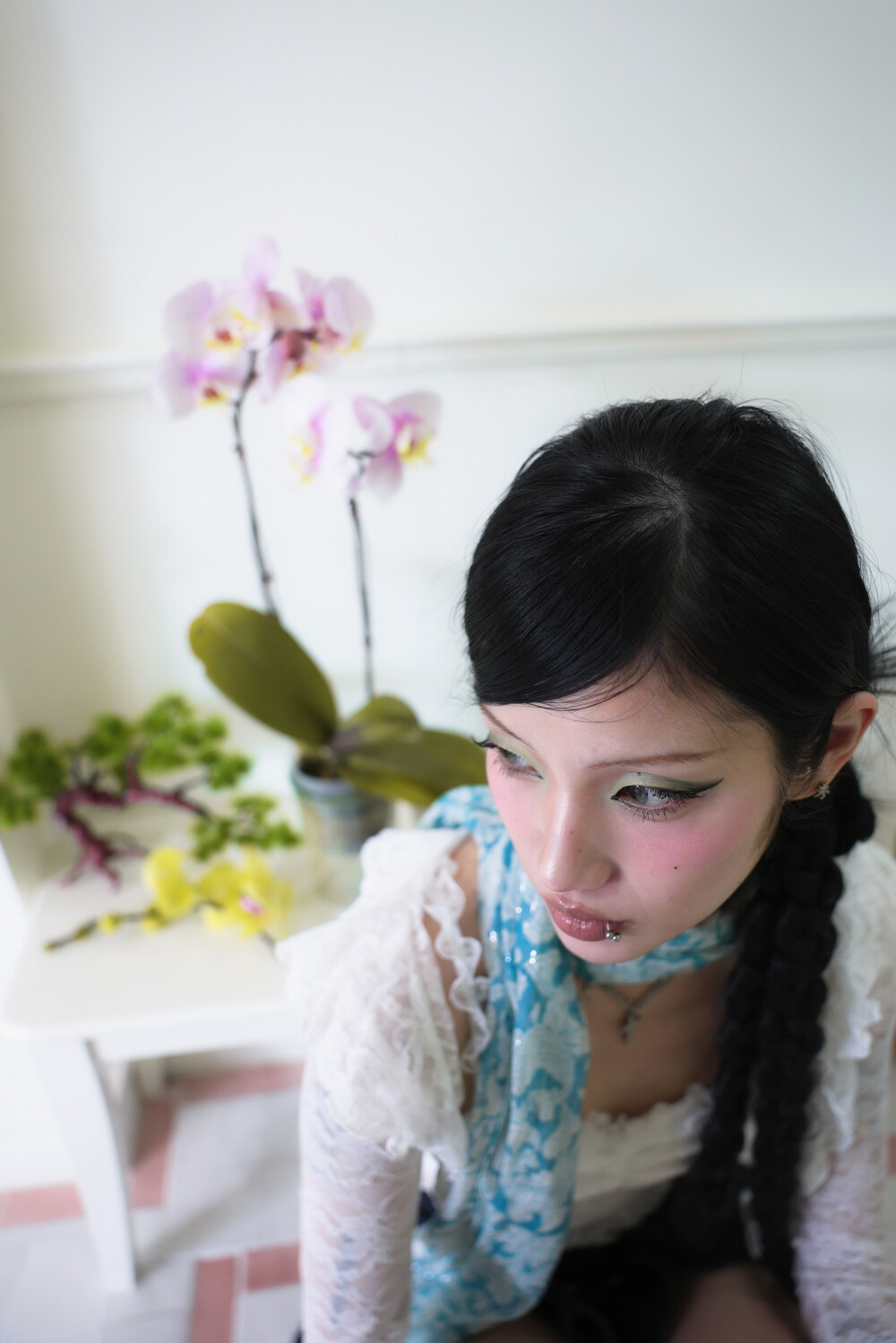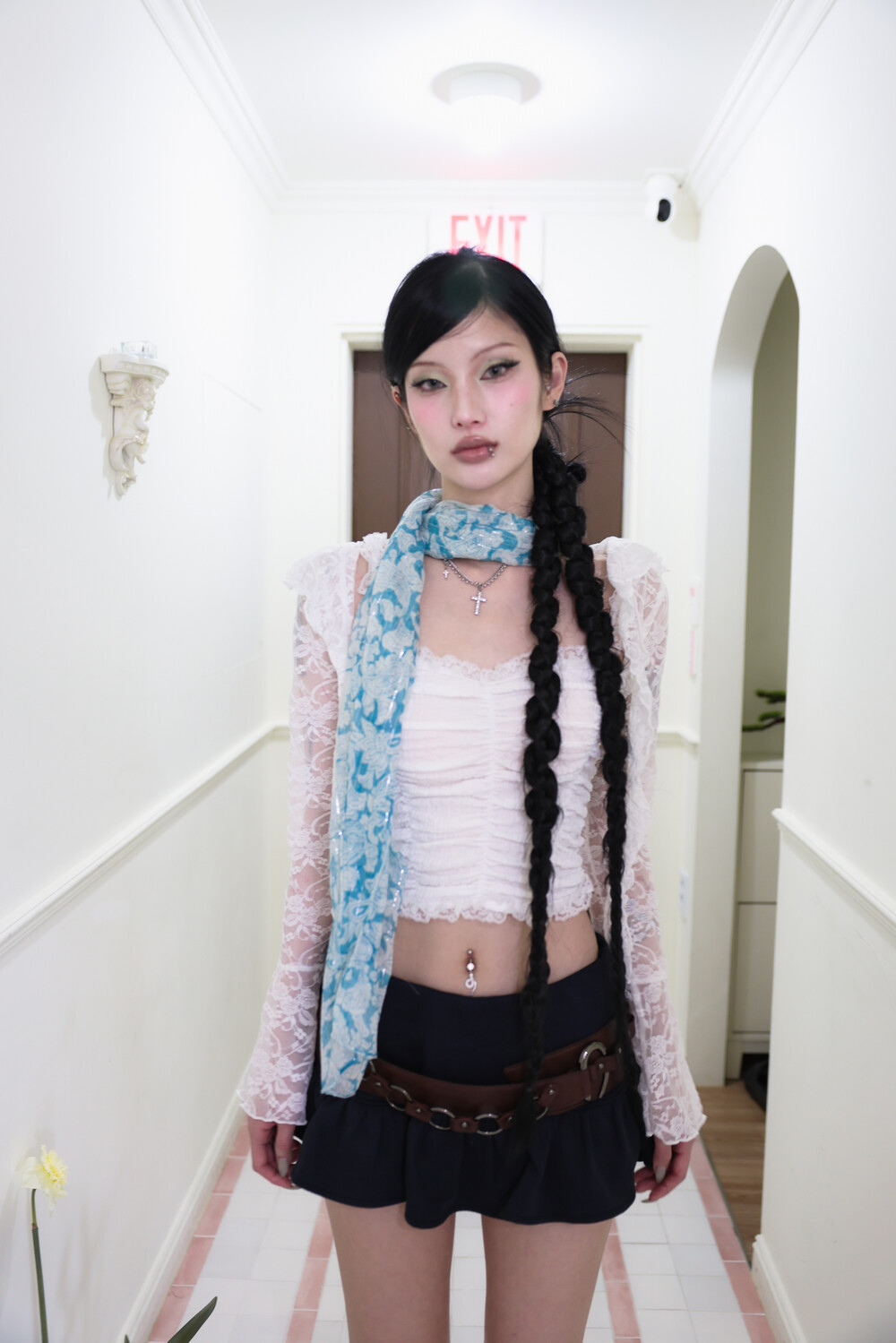 [Pink orchid house] Shirring lace frill top (3color) (White)