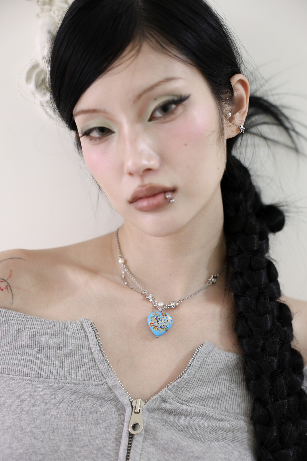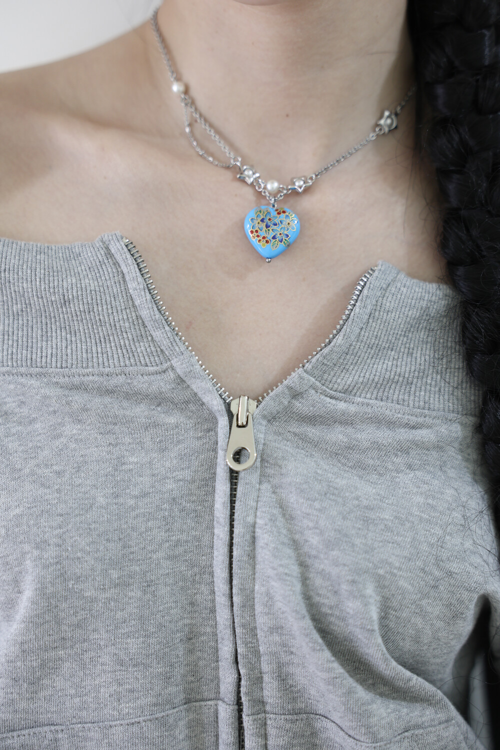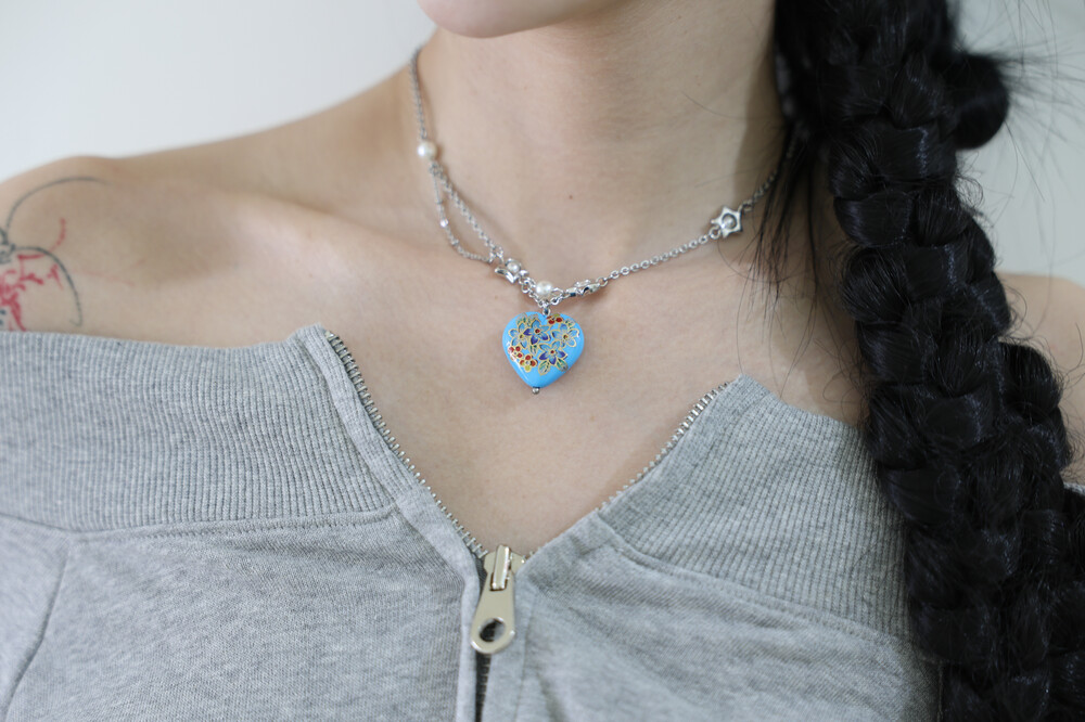 플라워 문양이 아름다운 볼드한 하트 펜던트와 진주, 별 펜던트의 조화가 매력적인 목걸이 입니다.