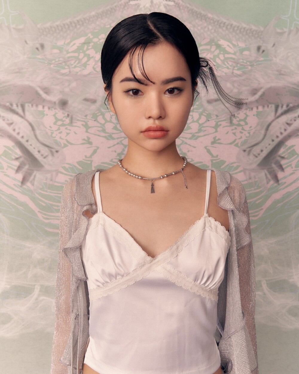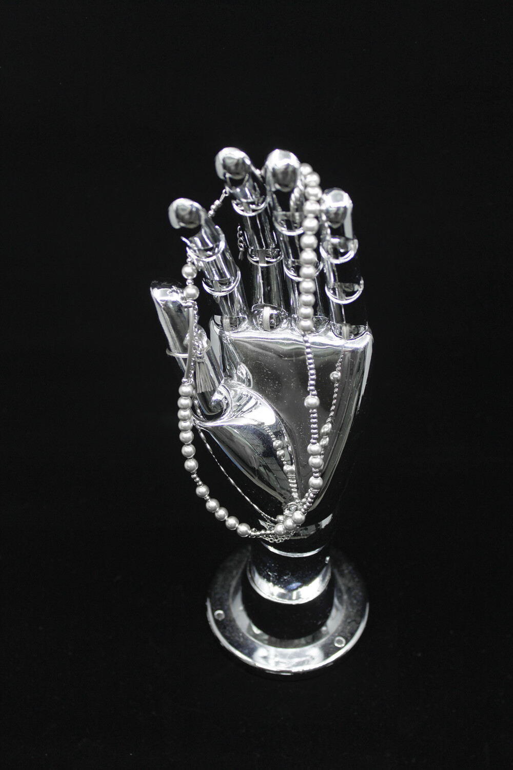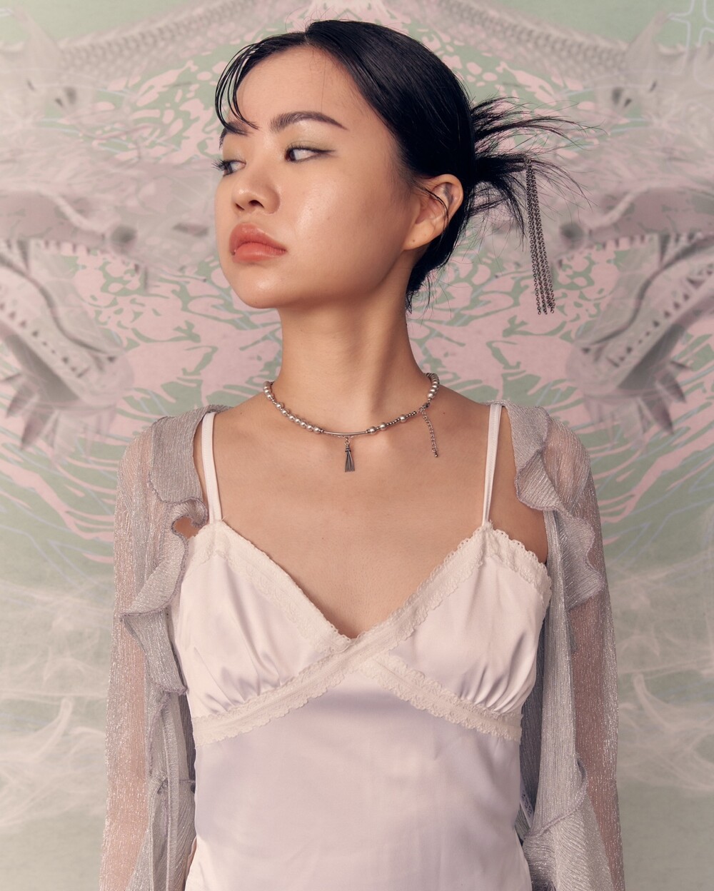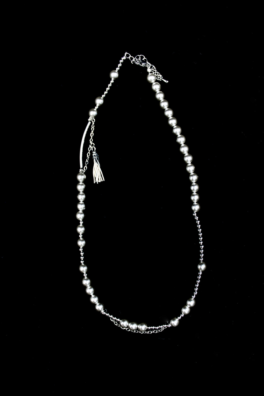 실버 컬러의 체인과 볼을 사용하여, 공상적이면서도 동양적인 구슬 목걸이
