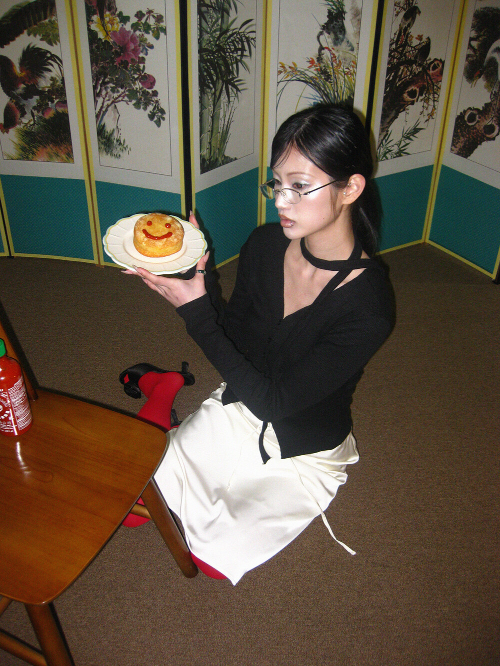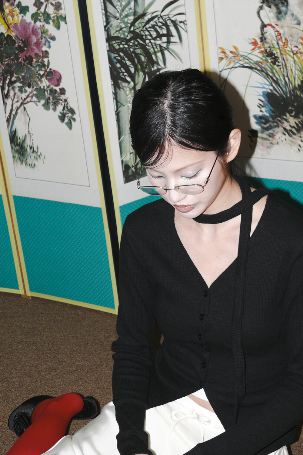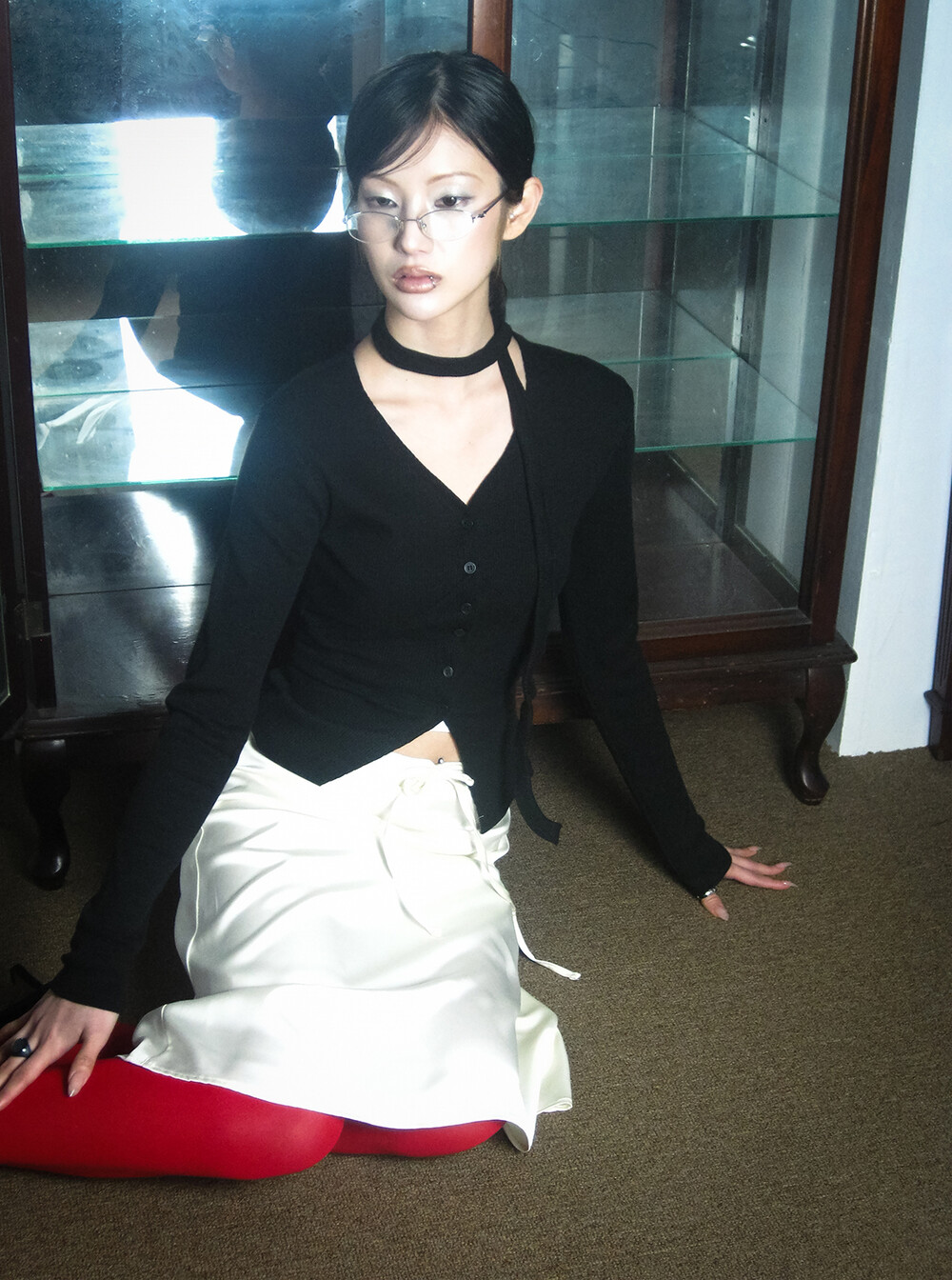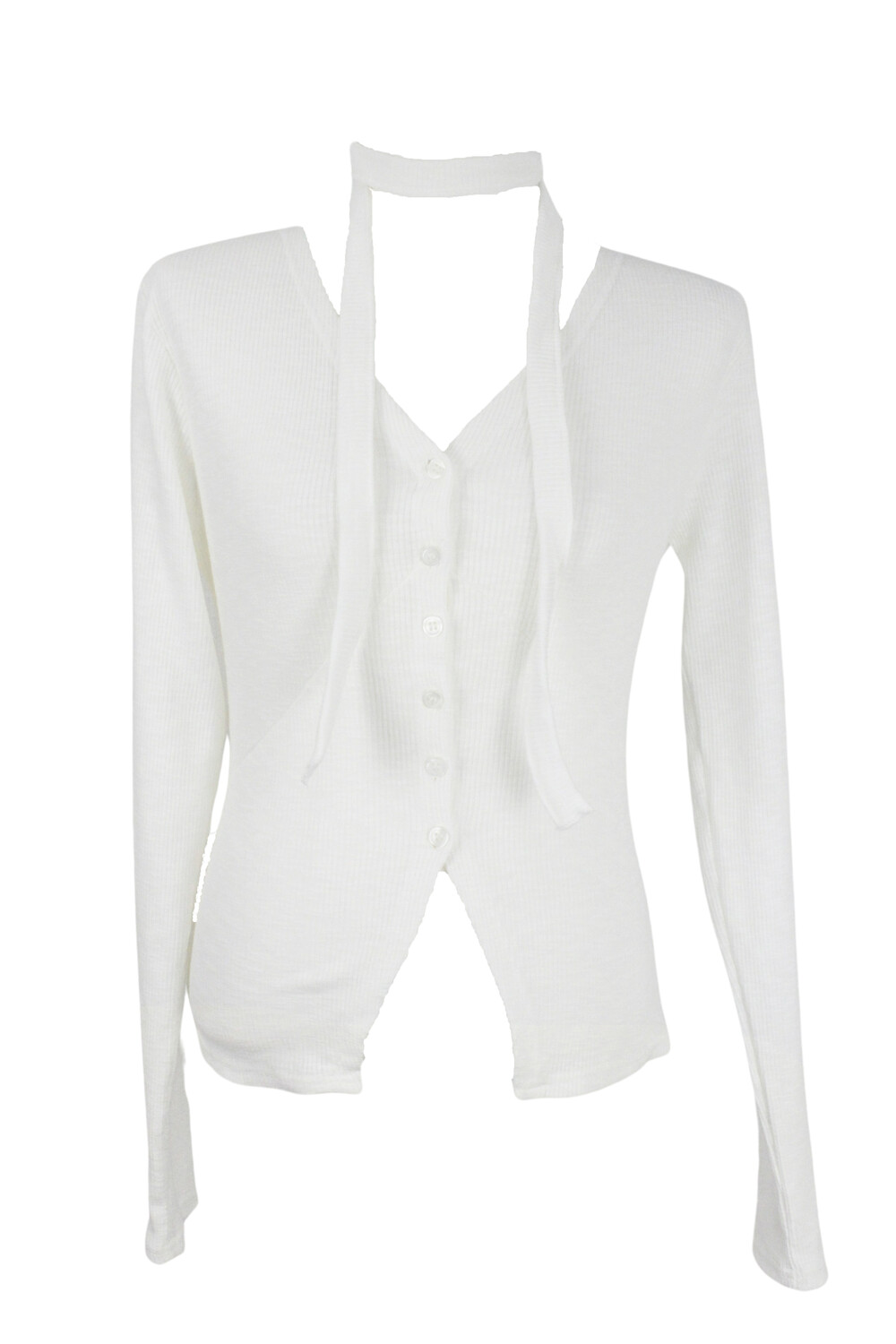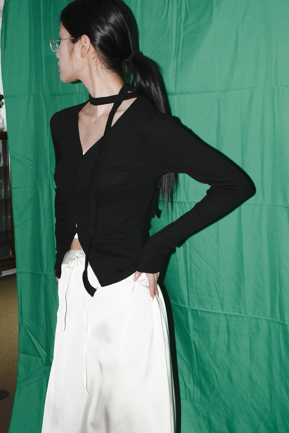 하루[春] - Slit v-neck cardigan set (Black/White)
