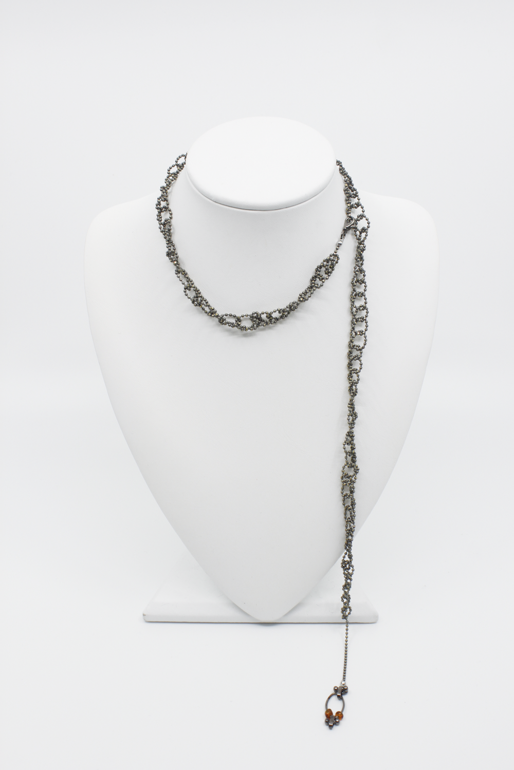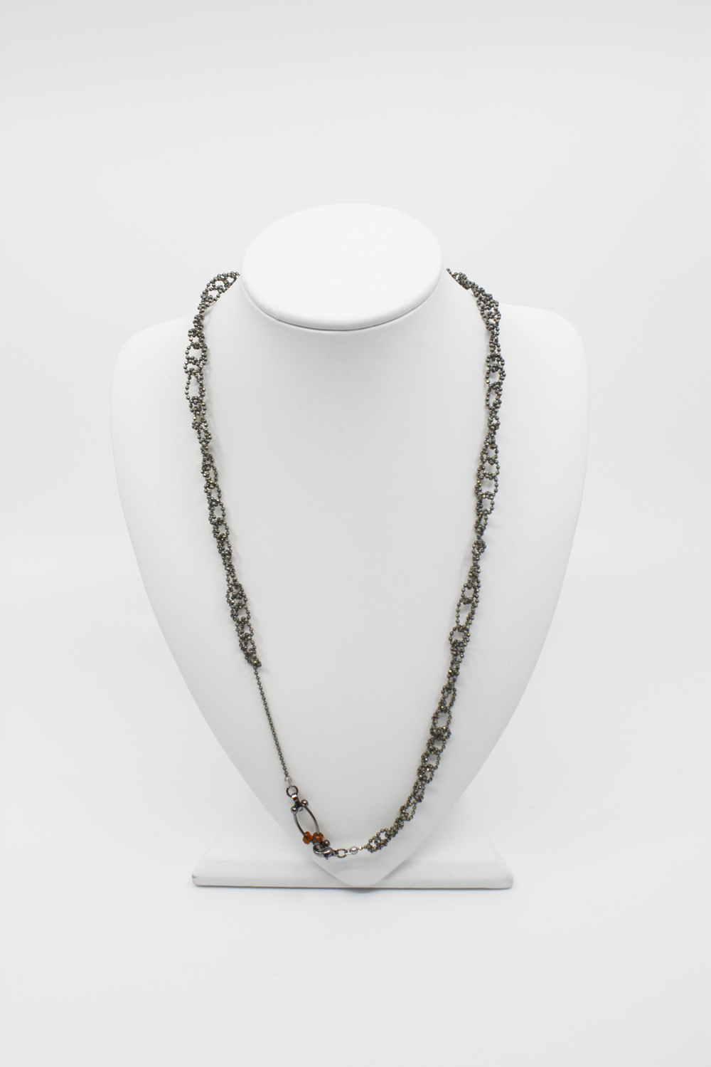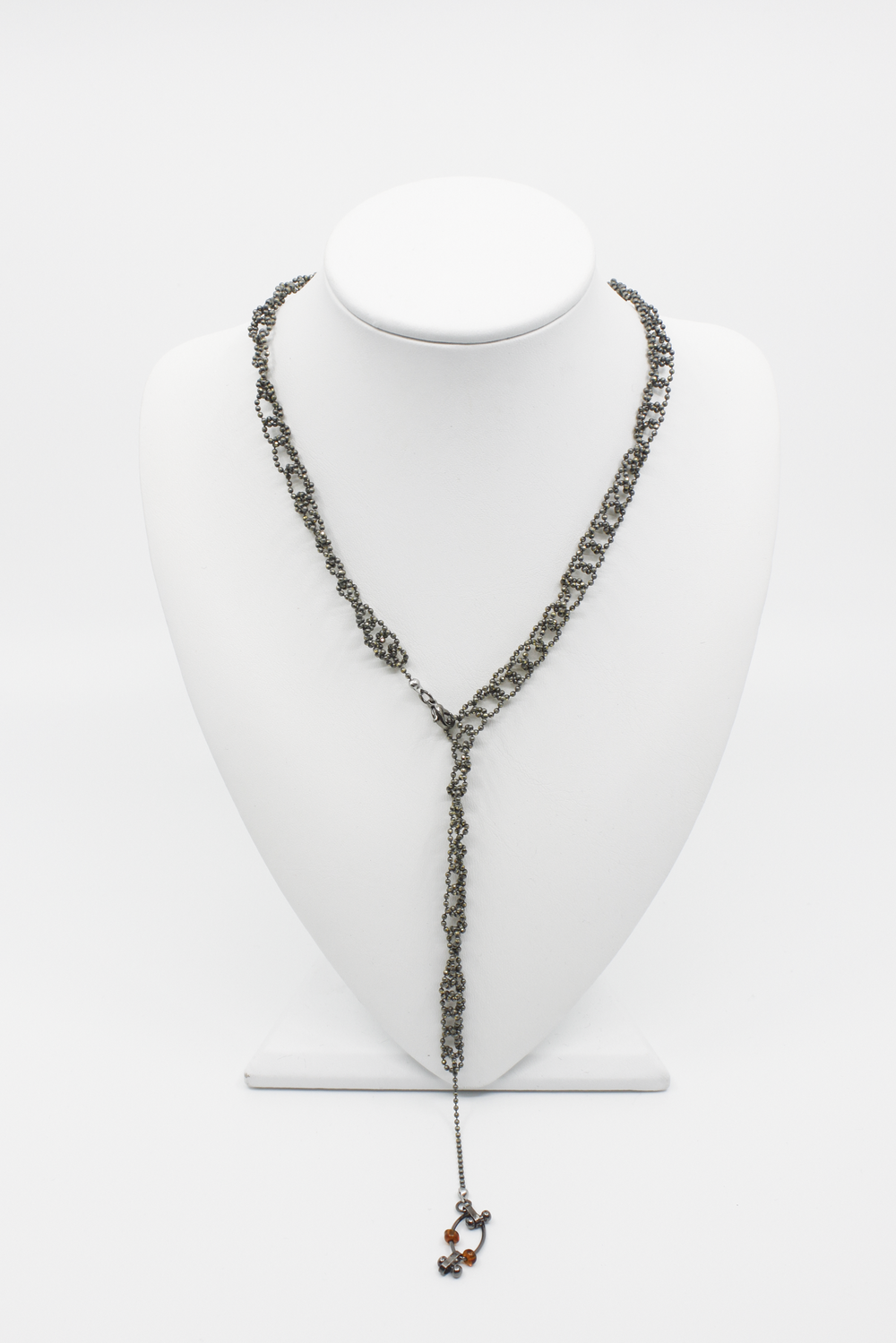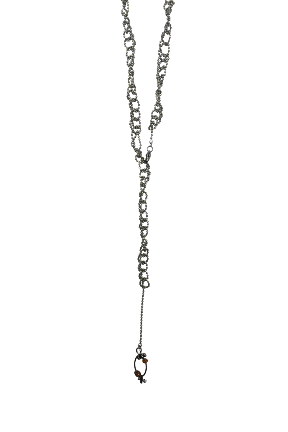 끝 부분에 브라운 컬러의 비즈가 들어간 타원형 펜던트를 연결해 포인트를 주었습니다.