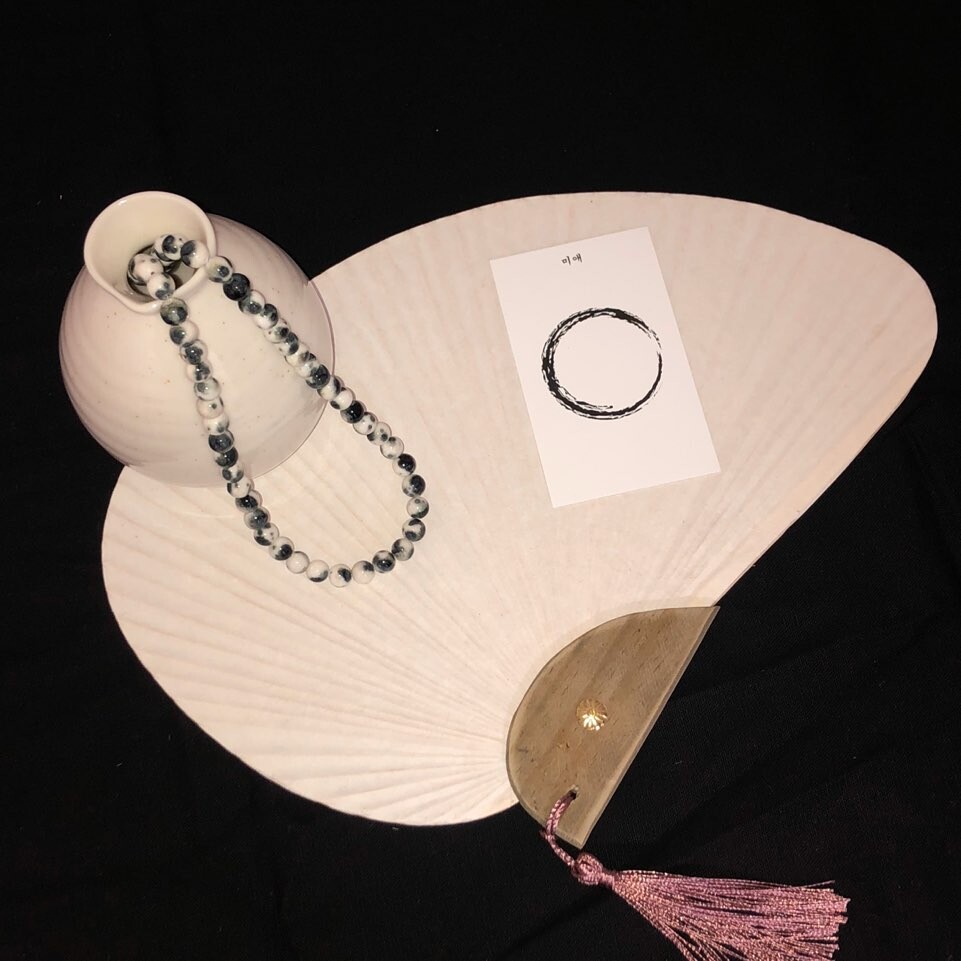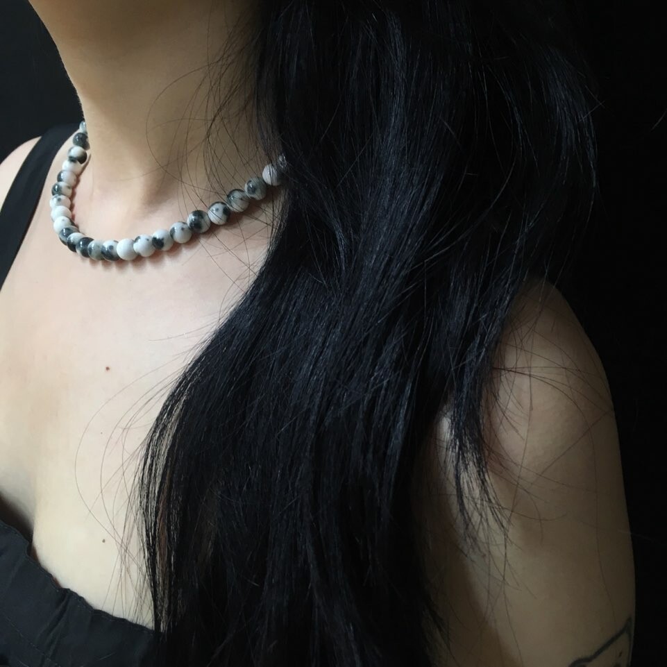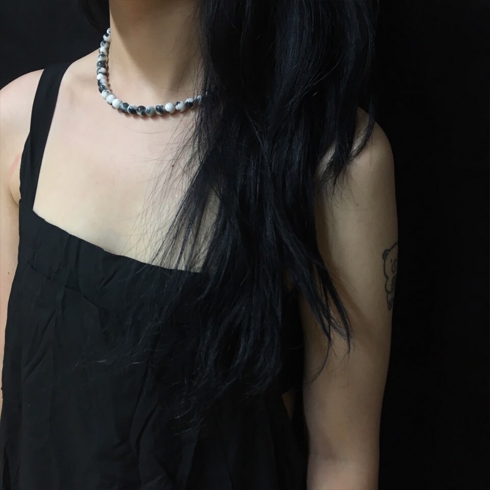 흰색 구슬에 검은색 물감이 오묘하게 물든듯한 비즈 목걸이로,